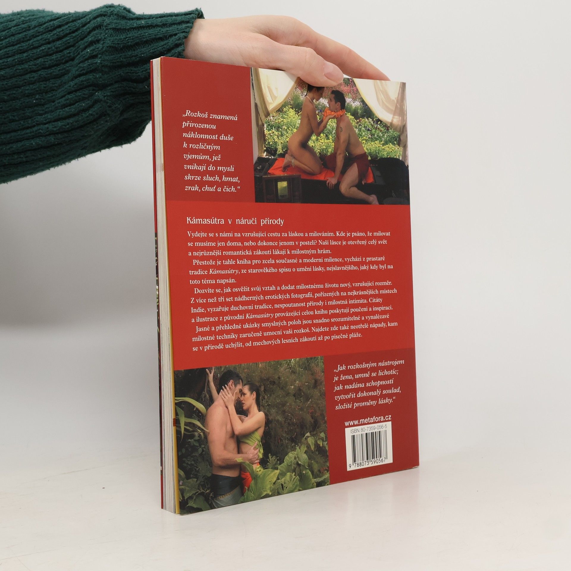 Inspirující, romantický průvodce vášní a milováním pod širým nebem... Přes 300 barevných fotografií z Indie... Vydejte se s námi na vzrušující cestu za láskou a milováním. Kde je psáno, že milovat se musíme jen doma, nebo dokonce jenom v posteli? Naší lásce je otevřený celý svět a nejrůznější romantická zákoutí lákají k milostným hrám. Přestože je tahle kniha pro zcela současné a moderní milence, vychází z prastaré tradice Kámasútry, ze starověkého spisu o umění lásky, nejslavnějšího, jaký kdy byl na toto téma napsán. Dozvíte se, jak osvěžit svůj vztah a dodat milostnému životu nový, vzrušující rozměr. Z více než tří set nádherných erotických fotografií, pořízených na nejkrásnějších místech Indie, vyzařuje duchovní tradice, nespoutanost přírody i milostná intimita. Citáty a ilustrace z původní Kámasútry provázející celou knihu poskytují poučení a inspiraci. Jasné a přehledné ukázky smyslných poloh jsou snadno srozumitelné a vynalézavé milostné techniky zaručeně umocní vaši rozkoš. Najdete zde také neotřelé nápady, kam se v přírodě uchýlit, od mechových lesních zákoutí až po písečné pláže.