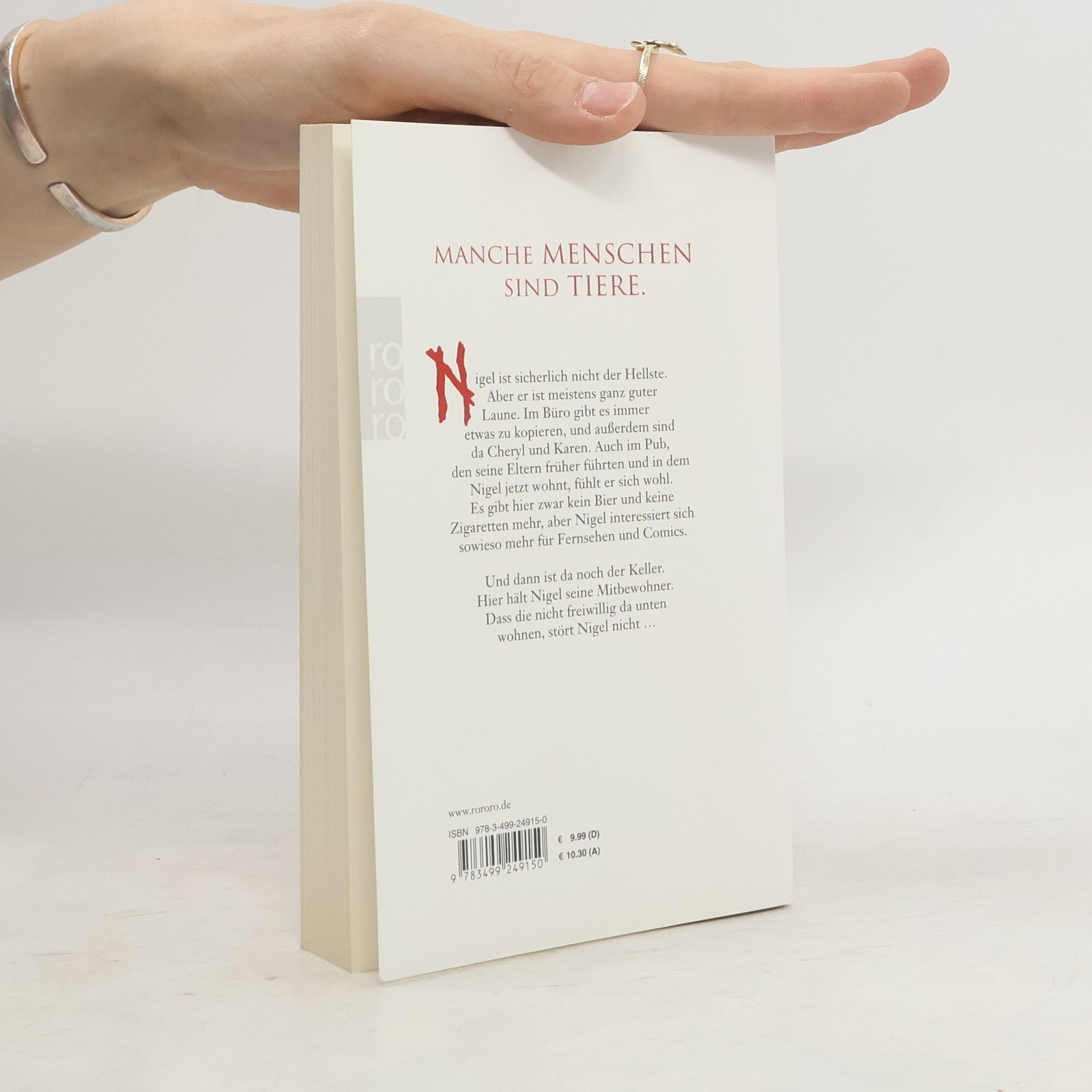 Manche Menschen sind Tiere.Nigel ist sicherlich nicht der Hellste. Aber er ist meistens ganz guter Laune. Im Büro gibt es immer etwas zu kopieren, und außerdem sind da Cheryl und Karen. Auch im Pub, den seine Eltern früher führten und in dem Nigel jetzt wohnt, fühlt er sich wohl. Es gibt hier zwar kein Bier und keine Zigaretten mehr, aber Nigel interessiert sich sowieso mehr für Fernsehen und Comics.Und dann ist da noch der Keller. Hier hält Nigel seine Mitbewohner. Dass die nicht freiwillig da unten wohnen, stört Nigel nicht …