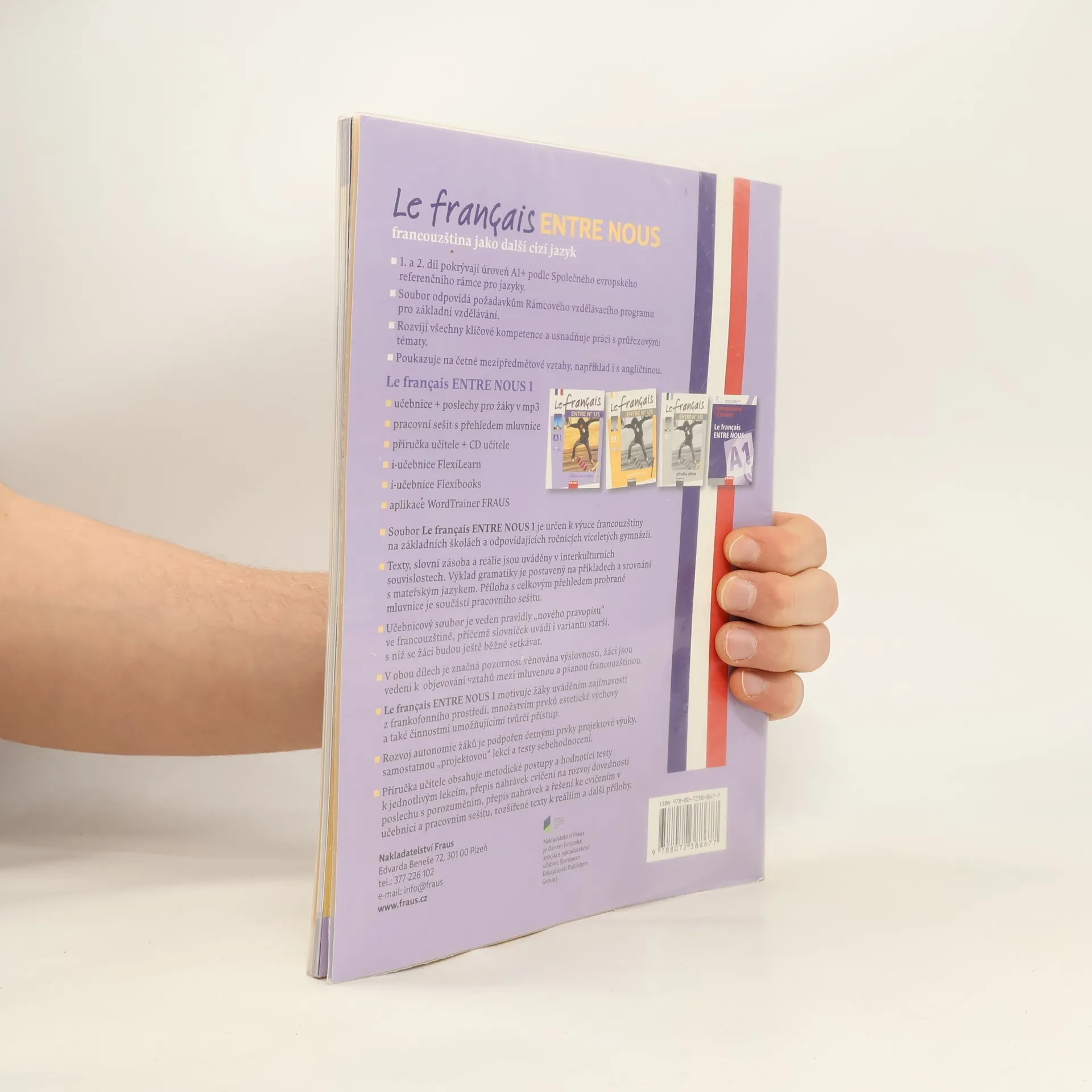 Dvoudílný soubor učebnic je určen pro výuku francouzštiny jako dalšího cizího jazyka v 8. (resp. 7.) ročníku základních škol a odpovídajících ročnících víceletých gymnázií, pokrývající úroveň A1 podle SERR. Na stránce 6 se dozvíte o deseti důvodech, proč se učit francouzsky, přičemž první díl je v češtině a druhý ve francouzštině, což usnadňuje orientaci v textu. Název učebnice, Le français ENTRE NOUS, zdůrazňuje význam francouzštiny v současném světě a zaměření na skutečnou komunikaci ve třídě. Učebnice je zábavným a užitečným nástrojem pro získávání znalostí o frankofonní kultuře a Evropské unii, a také pro rozvoj komunikačních dovedností. Mezi přednosti učebnice patří vedení podle pravidel "nového pravopisu" ve francouzštině, přičemž slovníček zahrnuje i starší variantu. Důraz je kladen na postupné osvojování zvukové stránky francouzštiny a na mezipředmětové vztahy, zejména s angličtinou. Obsahuje podněty pro interkulturní výchovu a využívá prvky projektového vyučování. Učebnice je dostupná v interaktivní podobě pro tabule, tablety, PC a notebooky. K dispozici je také zdarma aplikace WordTrainer FRAUS pro procvičování slovní zásoby z jednotlivých lekcí.