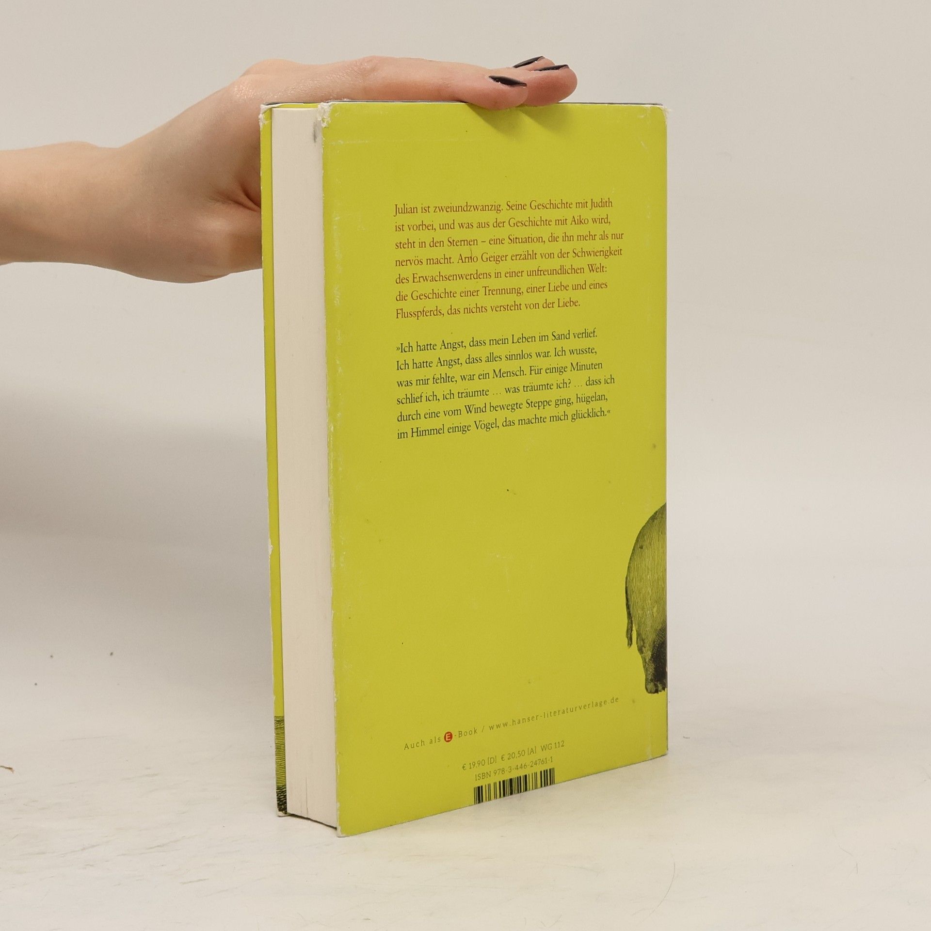 Wie fühlt es sich an, heute jung zu sein? Arno Geiger erzählt von Julian, einem Studenten der Veterinärmedizin, der seine erste Trennung erlebt und erstaunt ist, wie viel Unordnung so eine Trennung schafft. Um die Unordnung ein wenig zu lindern, übernimmt er bei Professor Beham die Pflege eines Zwergflusspferds, das bald den Rhythmus des Sommers bestimmt: es isst, gähnt, taucht und stinkt. Julian verliebt sich in Aiko, die Tochter des Professors, verfolgt beunruhigt, wie täglich Schockwellen von Katastrophen um den Erdball fluten und durchlebt eine Zeit des Umbruchs und Neuanfangs. Ein Roman über die Suche nach einem Platz in der Welt.