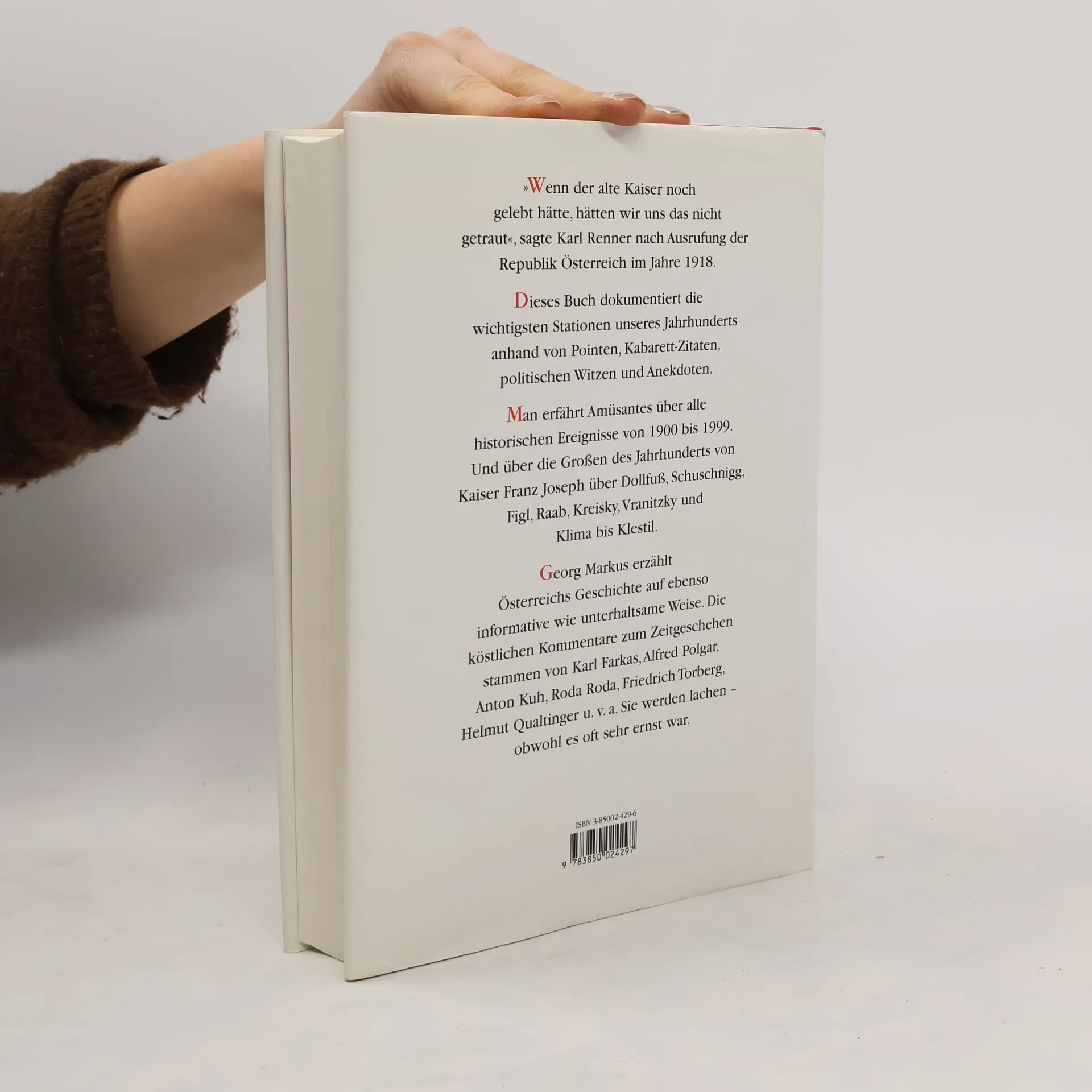 »Wenn der Kaiser noch gelebt hätte, hätten wir uns das nicht getraut«, sagte Karl Renner nach Ausrufung der Republik Österreich im Jahre 1918. Dieses Buch dokumentiert die wichtigsten Stationen unseres Jahrhunderts anhand von Pointen, Kabarett-Zitaten, politischen Witzen und Anekdoten. Man erfährt Amüsantes über alle historischen Ereignisse von 1900 bis 1999. Und über die Großen des Jahrhunderts von Kaiser Franz Joseph über Dollfuß, Schuschnigg, Figl, Raab, Kreisky, Vranitzky und Klima bis Klestil. Georg Markus erzählt Österreichs Geschichte auf ebenso informative wie unterhaltsame Weise. Die köstlichen Kommentare zum Zeitgeschehen stammen von Karl Farkas, Alfred Polgar, Anton Kuh, Roda Roda, Friedrich Torberg, Helmut Qualtinger u. v. a. Sie werden lachen – obwohl es oft sehr ernst war.