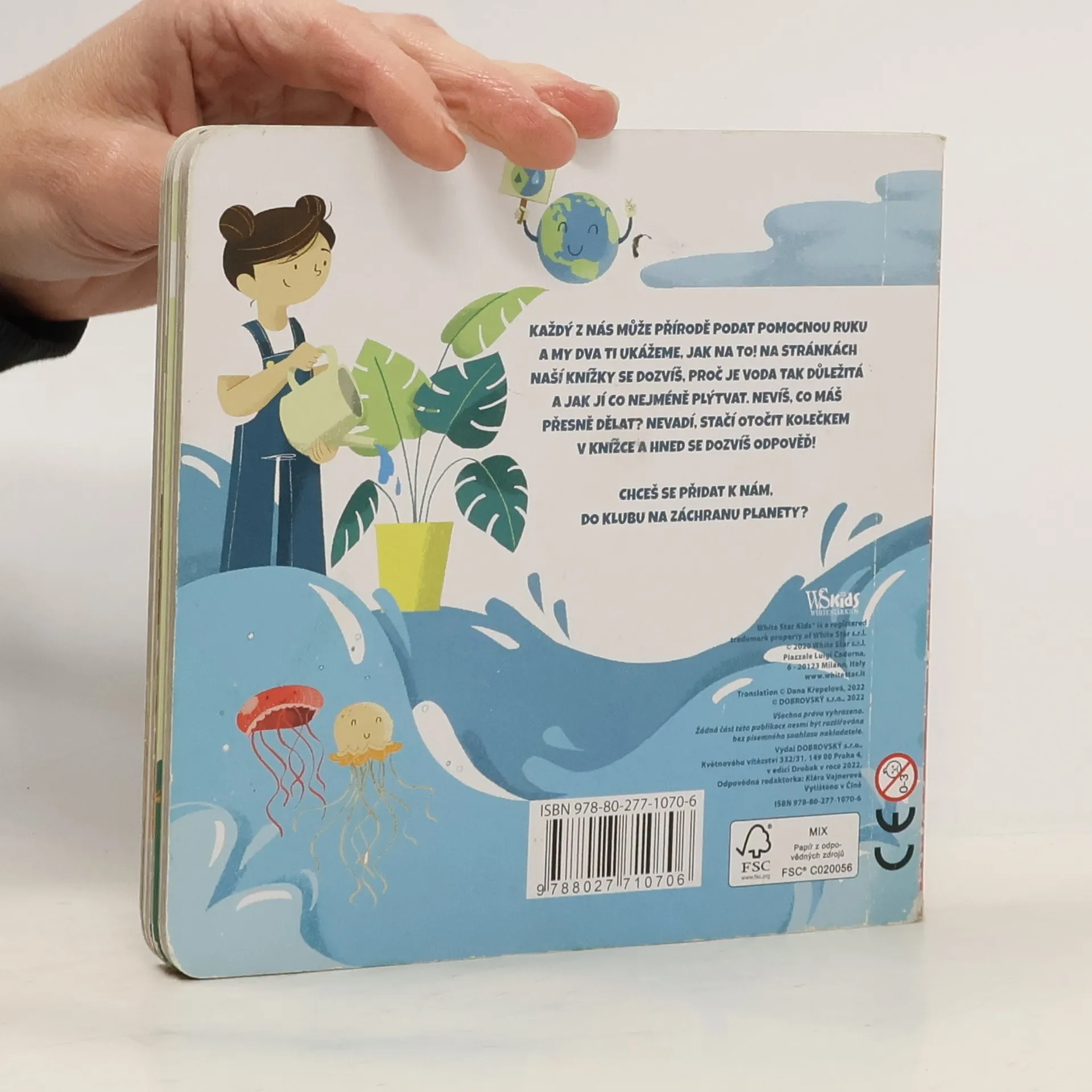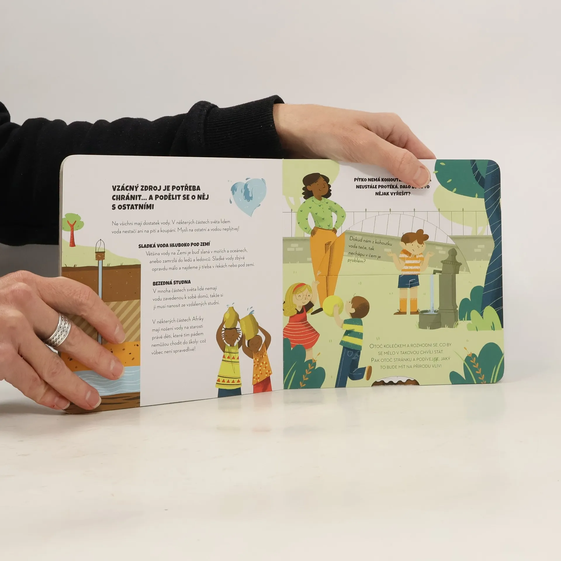 Všichni můžeme přírodě podat pomocnou ruku a my vám ukážeme, jak na to! Na stránkách naší knížky se dozvíte, proč je voda tak důležitá a jak s ní co nejméně plýtvat. Nejste si jisti, co máte dělat? Stačí otočit kolečkem v knížce a odpovědi se objeví! Tato řada leporel pomůže dětem se rozhodovat správně v situacích, kdy jde o záchranu planety! Po krátkém úvodu najdou děti na každé stránce otočné kolečko. Pokud jím otočí tak, že výsledkem bude ekologické řešení, následující stránka bude zobrazovat šťastný konec. Pokud se ale rozhodnou neekologicky, v životním prostředí se stane něco špatného… ale z této zkušenosti se mohou poučit a znovu se nad svým chováním zamyslet! Je to jednoduchý, ale účinný nápad, jak dětem ukázat, že jejich chování ovlivňuje celou planetu. Mohou se z toho poučit a odnést si cenné lekce do života.