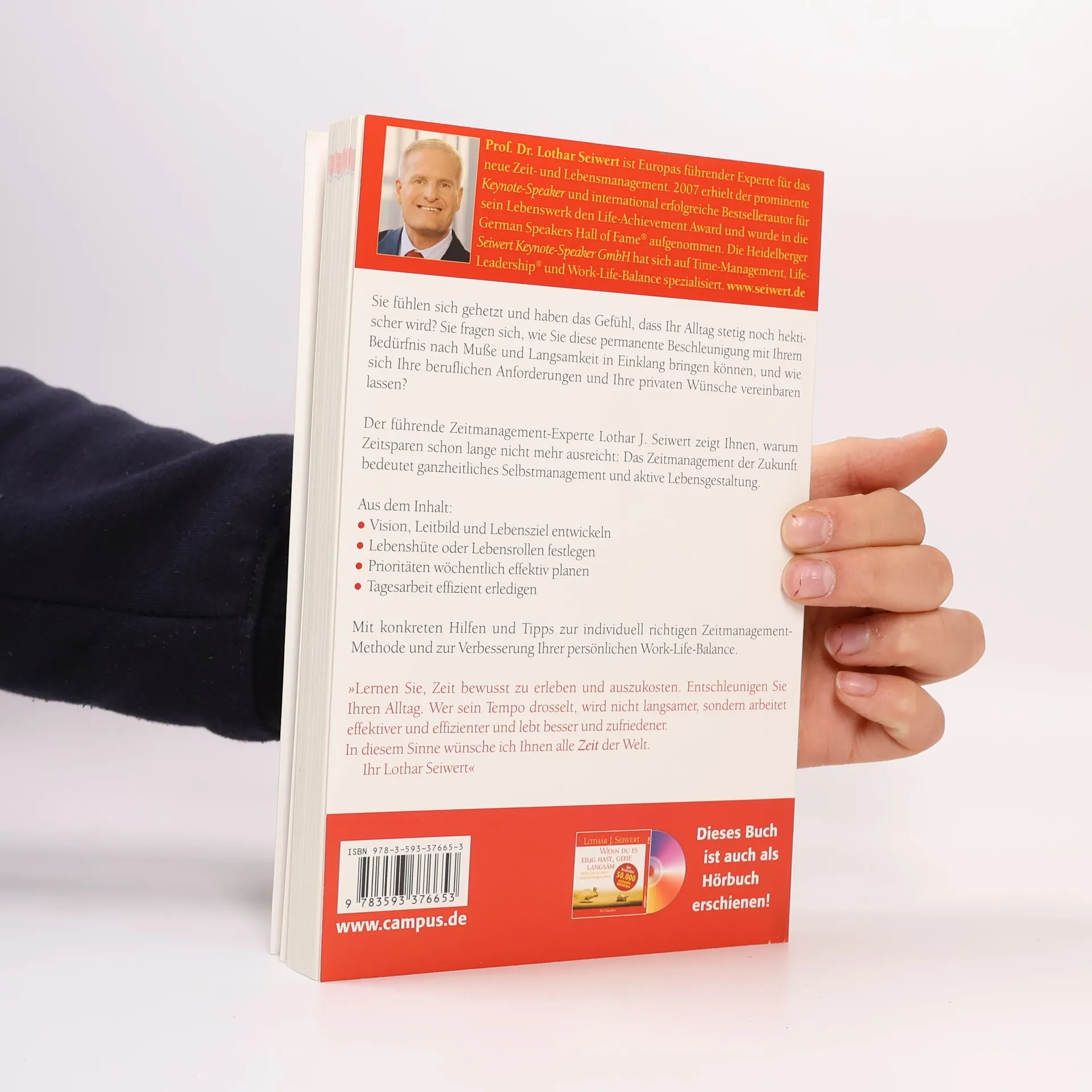 Seiwert macht seinen Lesern bewusst, dass unsere Lebenszeit das kostbarste Gut ist, das wir besitzen. In vier Schritten zeigt er, wie wir mit den richtigen Strategien unseren Alltag in den Griff bekommen und zu einer besseren Lebensgestaltung finden: 1. Die Lebensvision entwickeln 2. Die Lebensrollen definieren 3. Eine Prioritätenliste für jede Woche erstellen 4. Tägliche Aufgaben und Routinen im Griff Leben statt gelebt werden, jeden Tag proaktiv gestalten und sich gezielt mehr schöne Momente schaffen – in dem Bewusstsein »Heute ist der erste Tag vom Rest meines Lebens!«