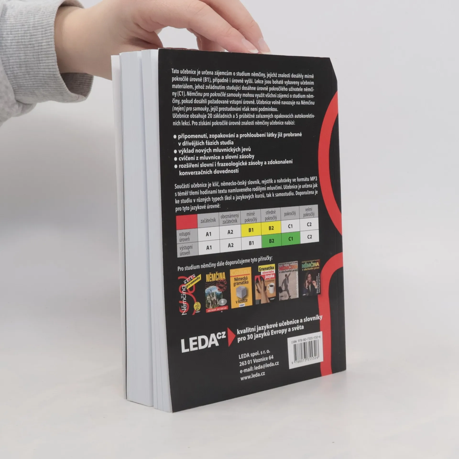 Učebnice je určena zájemcům o studium němčiny, jejichž znalosti dosáhly mírně pokročilé úrovně (B1), případně i úrovně vyšší. Lekce jsou bohatě vybaveny učebním materiálem, jehož zvládnutím studující dosáhne úrovně pokročilého uživatele němčiny (C1). Němčinu pro pokročilé samouky mohou využít všichni zájemci o studium němčiny, pokud dosáhli požadované vstupní úrovně. Učebnice volně navazuje na Němčinu (nejen) pro samouky, jejíž prostudování však není podmínkou. Učebnice obsahuje 20 základních a 5 průběžně zařazených opakovacích autokorektivních lekcí. Pro získání pokročilé úrovně znalosti němčiny učebnice nabízí: - připomenutí, zopakování a prohloubení látky již probrané v dřívějších fázích studia - výklad nových mluvnických jevů - cvičení z mluvnice a slovní zásoby - rozšíření slovní i frazeologické zásoby a zdokonalení konverzačních dovedností Součástí učebnice je klíč, německo-český slovník, rejstřík a nahrávky ve formátu MP3 s téměř třemi hodinami textu namluveného rodilými mluvčími. Učebnice je určena jak ke studiu v různých typech škol a jazykových kurzů, tak k samostudiu.