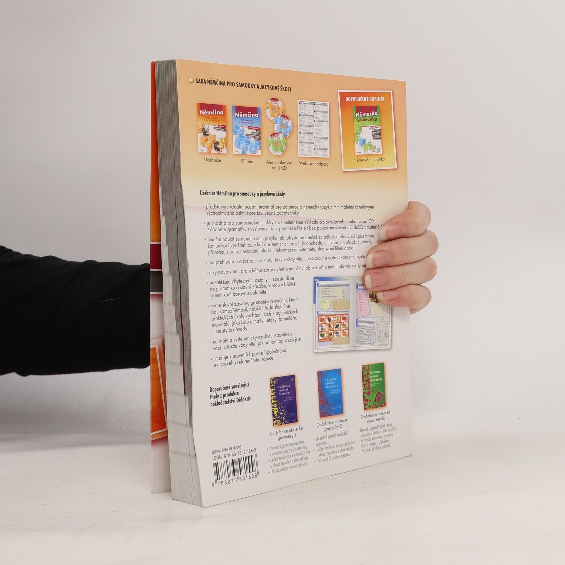 Sada složená z učebnice, přílohy a tří CD. Přehledná a graficky poutavá učebnice vhodná pro zájemce o němčinu s nulovými či minimálními výchozími znalostmi i pro věčné začátečníky obsahuje texty a slovní zásobu z řady praktických oblastí (práce, bydlení, cestování, kultura, nemoc), cvičení zaměřená na gramatiku a využitelná v praxi..