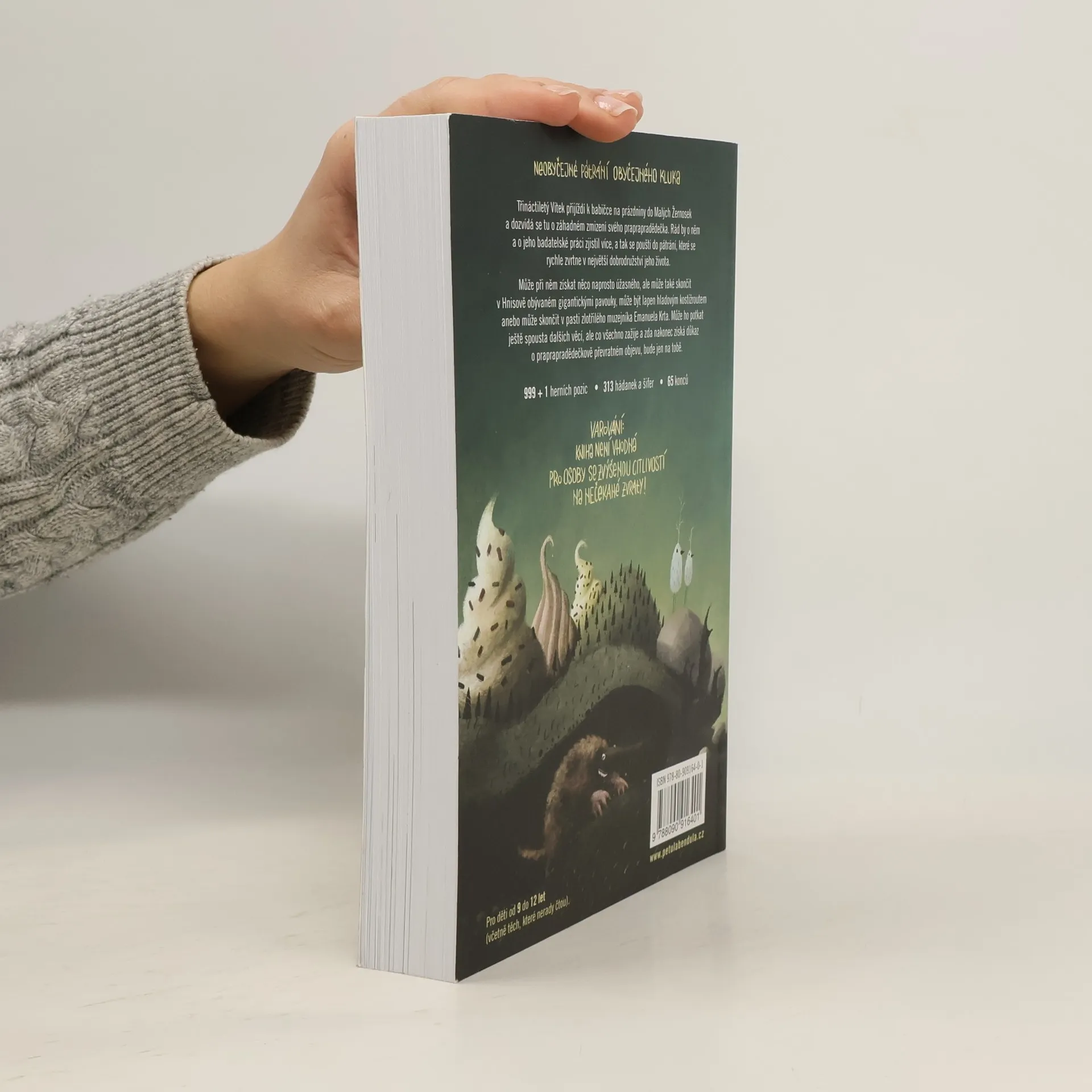 Třináctiletý Vítek přijíždí k babičce na prázdniny do Malých Žernosek a dozvídá se tu o záhadném zmizení svého praprapradědečka. Rád by o něm a o jeho badatelské práci zjistil více, a tak se pouští do pátrání, které se rychle zvrtne v největší dobrodružství jeho života. Může při něm získat něco naprosto úžasného, alemůže také skončit v Hnisově obývaném gigantickými pavouky, může být lapen hladovým kostižroutem anebo může skončit v pasti zlotřilého muzejníka Emanuela Krta. Může ho potkat ještě spousta dalších věcí, ale co všechno zažije a zda nakonec získá důkaz o praprapradědečkově převratném objevu, bude jen na tobě. Varování: Kniha není vhodná pro osoby se zvýšenou citlivostí na nečekané zvraty! Vhodné pro čtenáře a hráče ve věku 9–12(0) let, ale ještě vhodnější pro celou rodinu. Knížku si může užít každý sám, ale díky četným hádankám a šifrám je vhodná i jako společná aktivita pro rodiče s dětmi. I proto jsem se snažila text psát tak, aby bavil i dospělé.