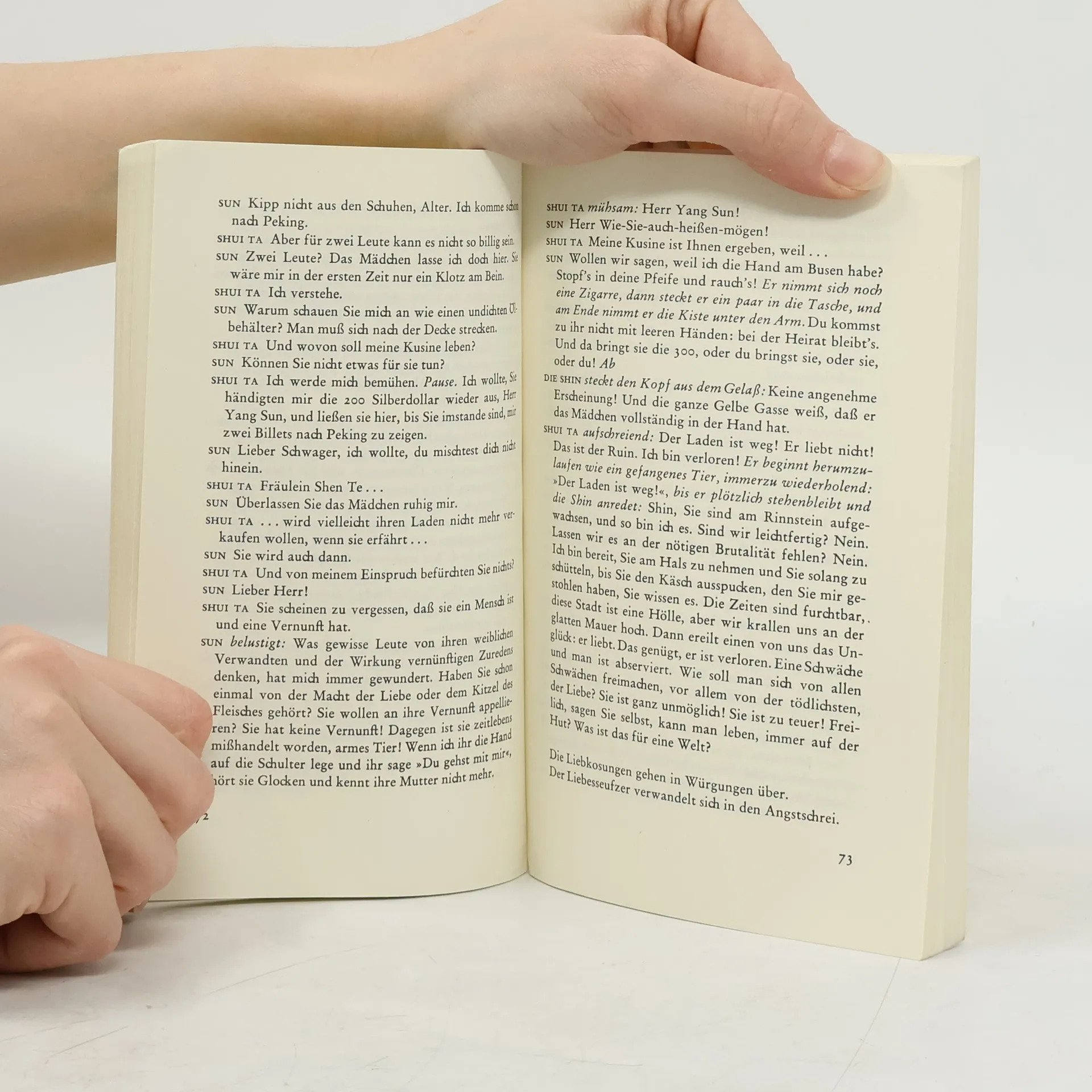 Das Stück, eine Parabel, zeigt am Einzelfall des Mädchens Shen Te das allgemeine Gesetz dieser Welt auf, daß es unmöglich ist, »gut zu sein und doch zu leben«. Drei Götter durchwandern die Welt auf der Suche nach einem guten Menschen. Sie wollen das Gerücht Lügen strafen, wonach die wirtschaftlichen Bedingungen auf Erden zu unerträglich seien, als daß die Menschen die Gebote der Götter zu befolgen vermöchten.