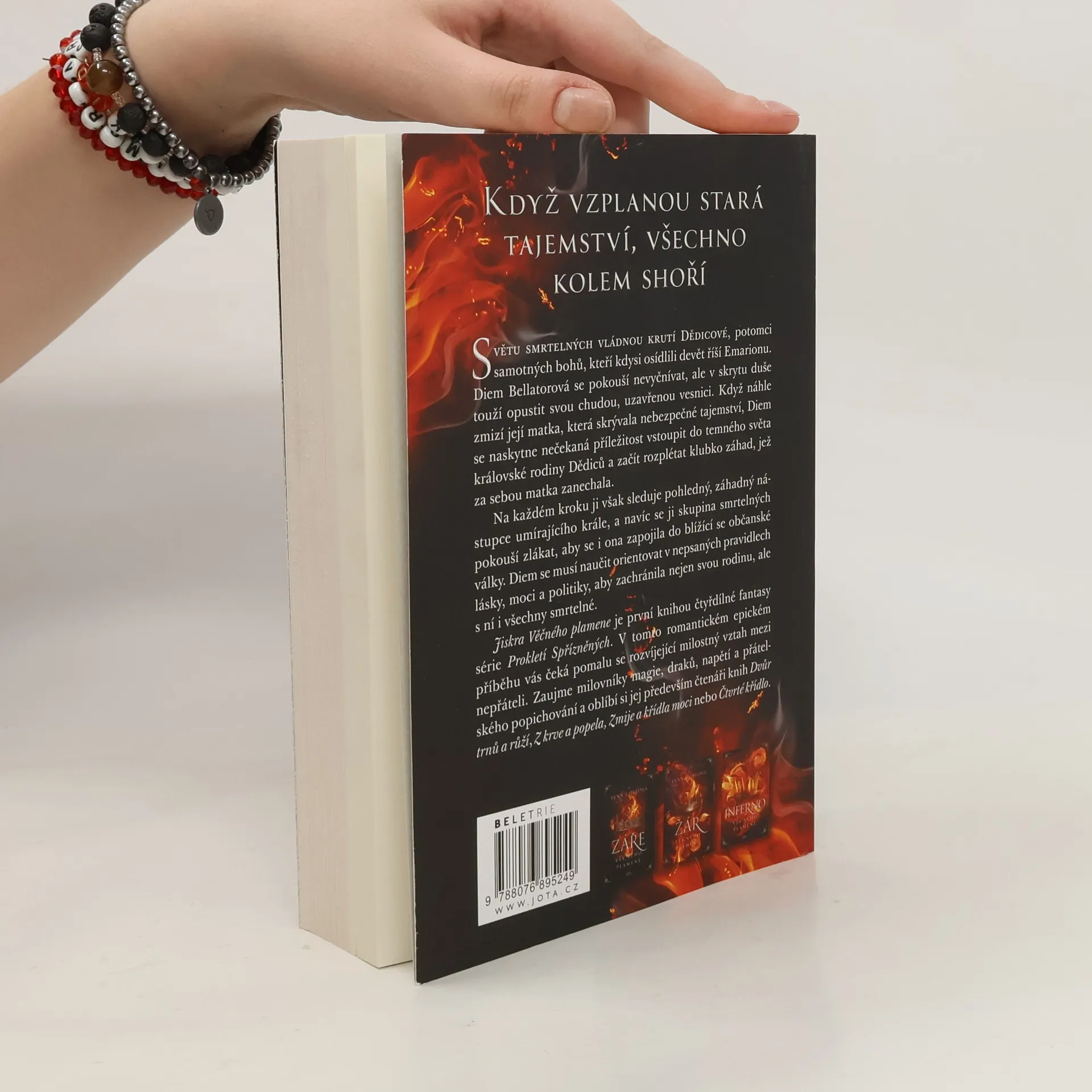 Když vzplanou stará tajemství, všechno kolem shoří. Světu smrtelných vládnou krutí Dědicové, potomci samotných bohů, kteří kdysi osídlili devět říší Emarionu. Diem Bellatorová se pokouší nevyčnívat, ale v skrytu duše touží opustit svou chudou, uzavřenou vesnici. Když náhle zmizí její matka, která skrývala nebezpečné tajemství, Diem se naskytne nečekaná příležitost vstoupit do temného světa královské rodiny Dědiců a začít rozplétat klubko záhad, jež za sebou matka zanechala. Na každém kroku ji sleduje pohledný, záhadný nástupce umírajícího krále. K tomu je tu skupina smrtelných, která se ji pokouší zlákat, aby se i ona zapojila do blížící se občanské války. Diem se musí naučit orientovat v nepsaných pravidlech lásky, moci a politiky, aby zachránila nejen svou rodinu, ale s ní i všechny smrtelné. Jiskra Věčného plamene je první knihou čtyřdílné fantasy série Prokletí Spřízněných. V tomto romantickém epickém příběhu vás čeká pomalu se rozvíjející vztah mezi nepřáteli. Zaujme milovníky magie, draků, napětí a přátelského popichování a oblíbí si jej především čtenáři knih Dvůr trnů a růží, Z krve a popela, Zmije a křídla noci nebo Čtvrté křídlo.