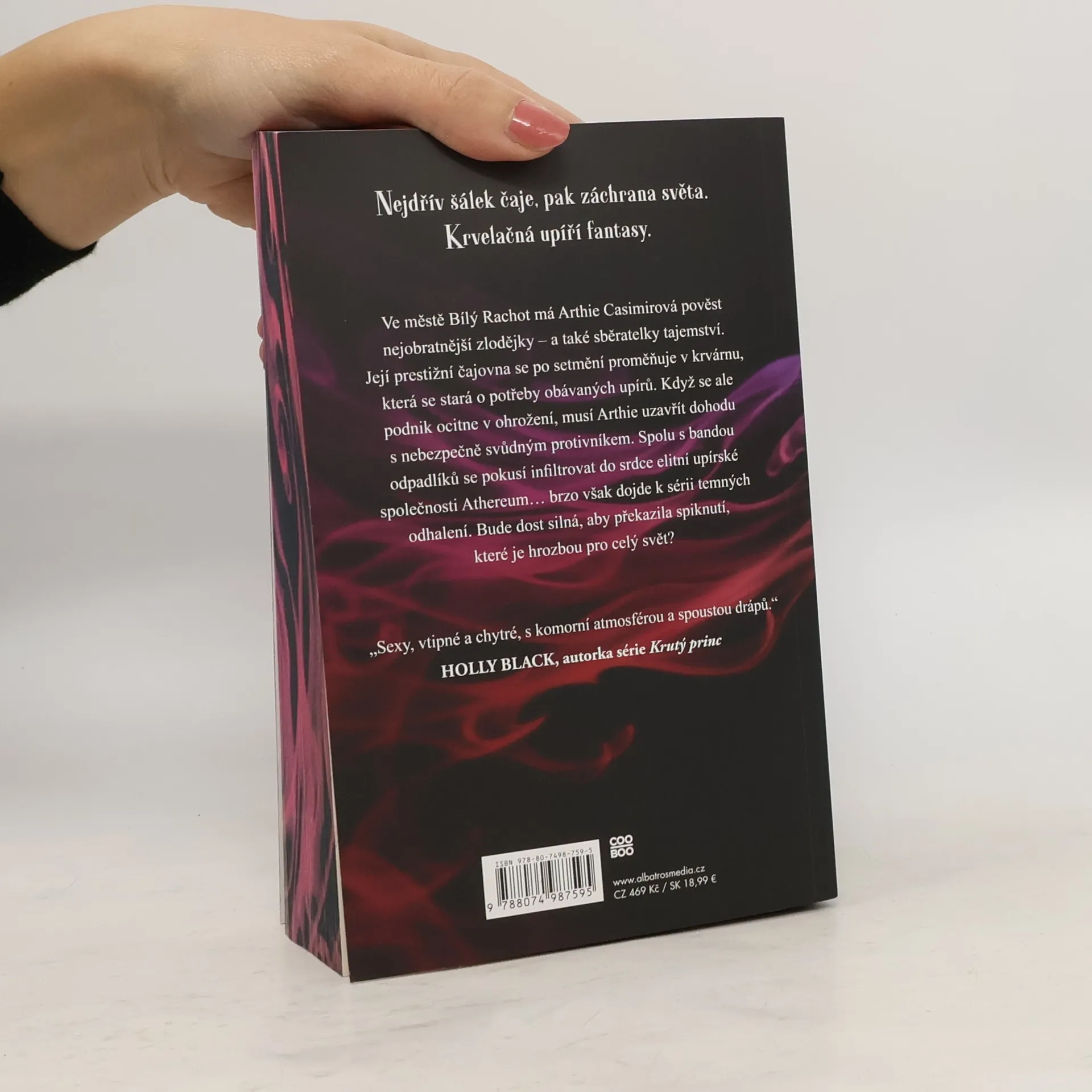 Nejdřív šálek čaje, pak záchrana světa. Krvelačná upíří fantasy. Ve městě Bílý Řev má Arthie Casimirová pověst nejobratnější zlodějky – a také sběratelky tajemství. Její prestižní čajovna se po setmění proměňuje v krvárnu, která se stará o potřeby obávaných upírů. Když se ale podnik ocitne v ohrožení, musí Arthieuzavřít dohodu s nebezpečně svůdným protivníkem. Spolu s bandou odpadlíků se pokusí infiltrovat do srdce elitní upírské společnosti Athereum... brzo však dojde k sérii temných odhalení. Bude dost silná, aby překazila spiknutí, které je hrozbou pro celý svět?