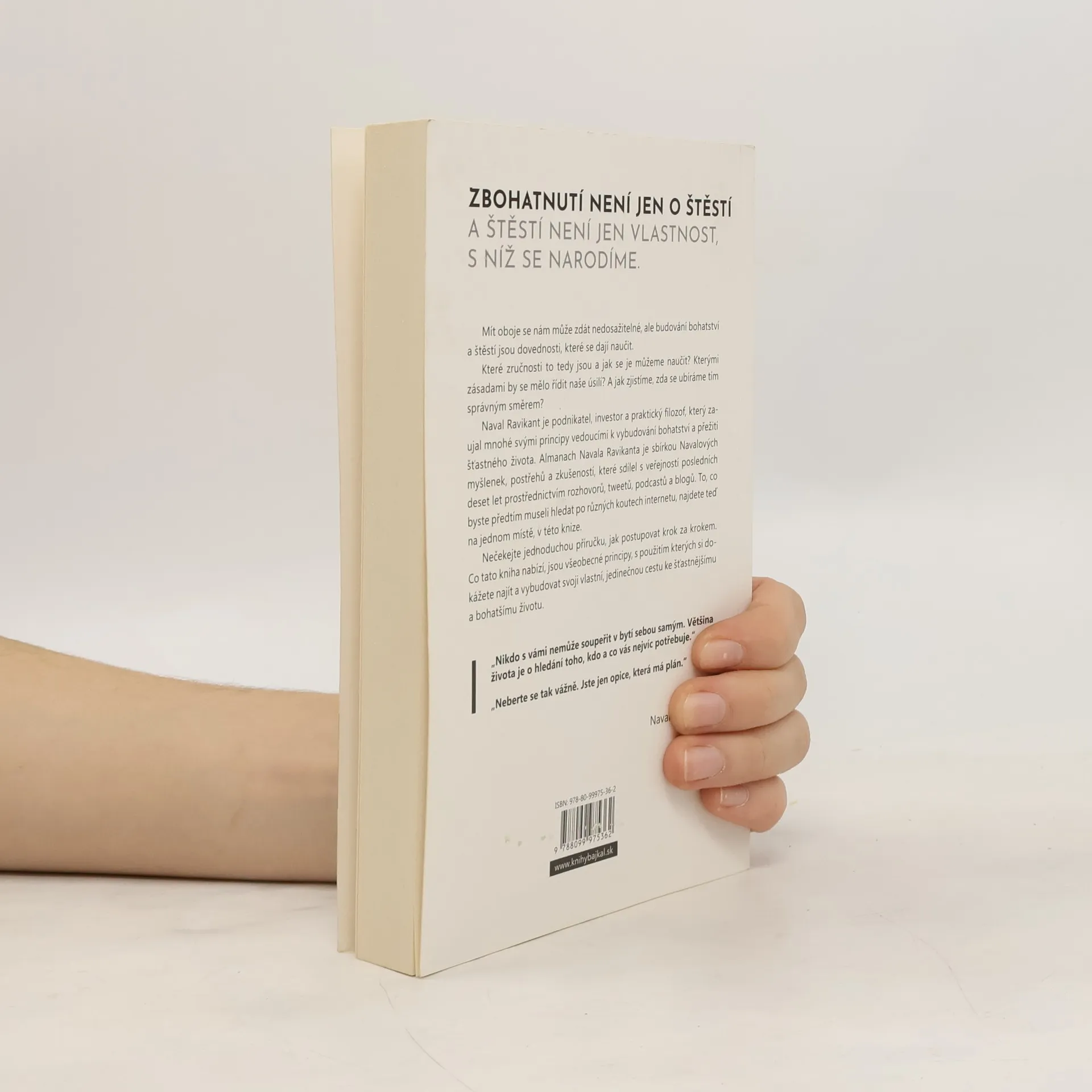 Zbohatnutí není jen o štěstí a štěstí není jen vlastnost, s níž se narodíme. Mít oboje se nám může zdát nedosažitelné, ale budování bohatství a štěstí jsou dovednosti, které se dají naučit. Naval Ravikant je podnikatel, investor a praktický filozof, který zaujal mnohé svými principy vedoucími k vybudování bohatství a přežití šťastného života. Almanach Navala Ravikanta je sbírkou Navalových myšlenek, postřehů a zkušeností, které sdílel s veřejností posledních deset let prostřednictvím rozhovorů, tweetů, podcastů a blogů. To, co byste předtím museli hledat po různých koutech internetu, najdete teď na jednom místě, v této knize. Nečekejte jednoduchou příručku, jak postupovat krok za krokem. Co tato kniha nabízí, jsou všeobecné principy, s použitím kterých si dokážete najít a vybudovat svoji vlastní, jedinečnou cestu ke šťastnějšímu a bohatšímu životu.