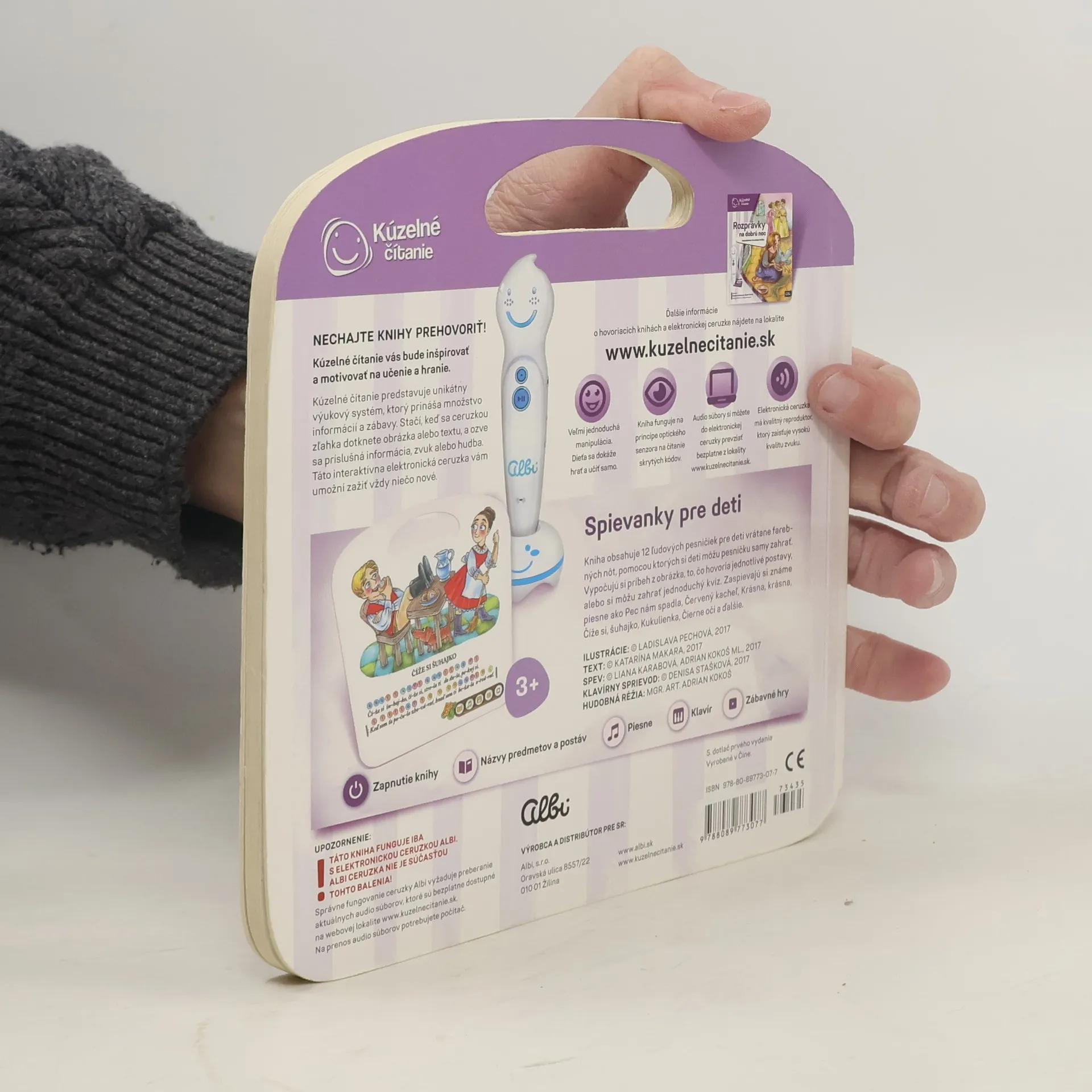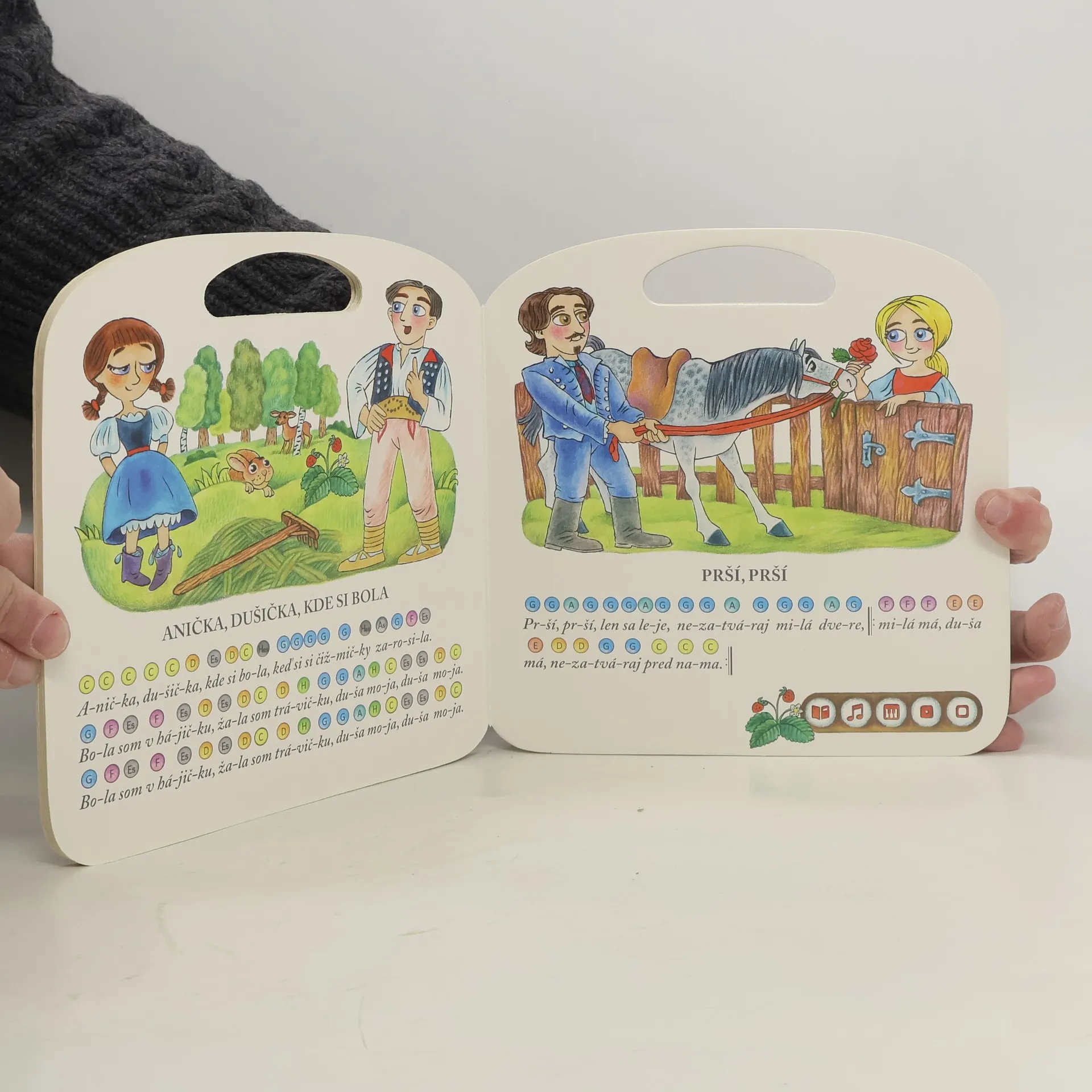 Hovoriaca kniha obsahuje 12 ľudových pesničiek pre deti vrátane farebných nôt, pomocou ktorých si deti môžu pesničku samy zahrať. Vypočujú si príbeh z obrázka, čo hovoria jednotlivé postavy alebo si môžu zahrať jednoduchý kvíz. Zaspievajú si známe piesne ako Pec nám spadla, Červený kacheľ, Krásna, krásna, Číže si šuhajko, Kukulianka, Čierne oči a ďalšie. Hovoriaca kniha obsahuje viac ako 450 zvukov a textov. Knihu nahovorili známi slovenskí herci Monika Hilmerová a Peter