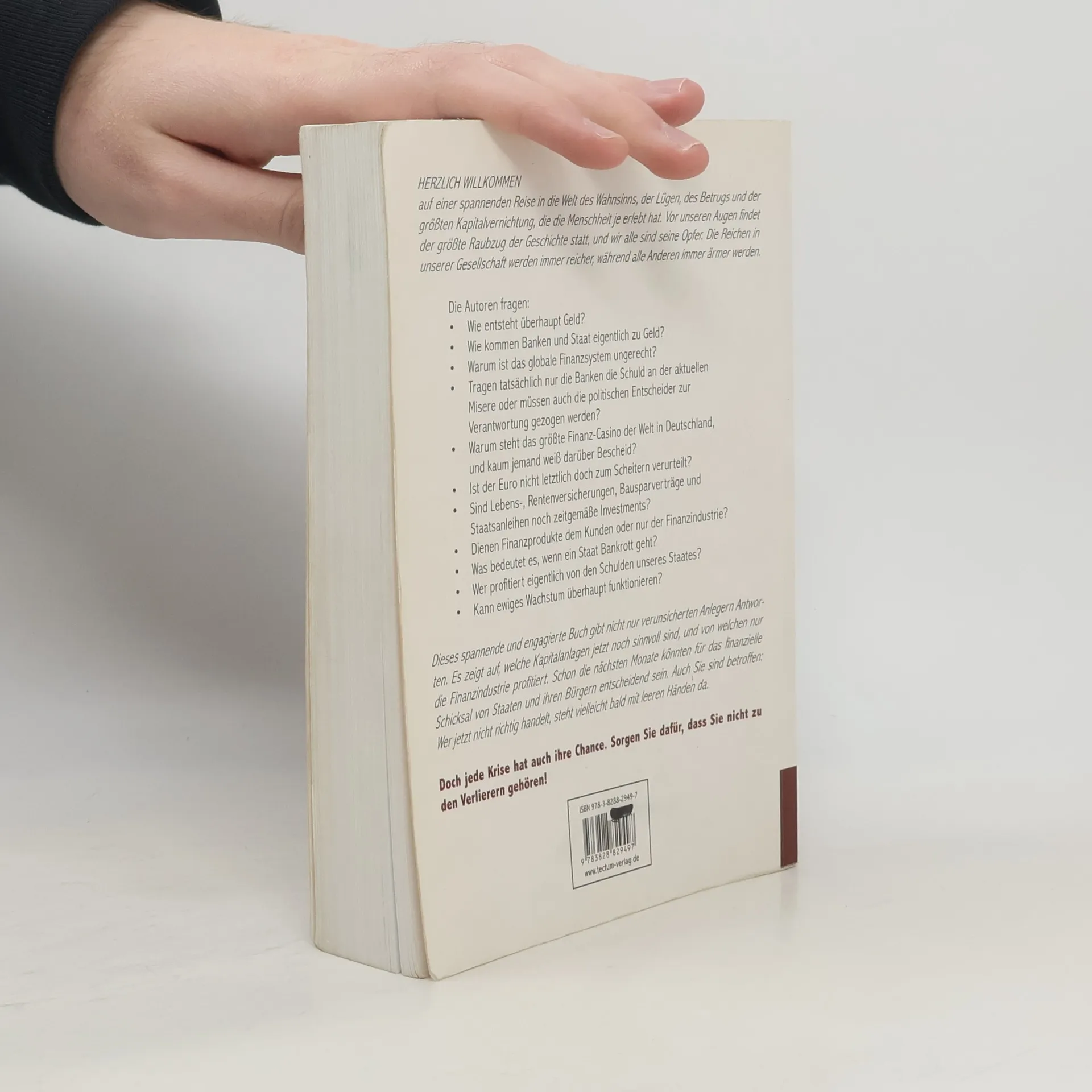 HERZLICH WILLKOMMEN auf einer spannenden Reise in die Welt des Wahnsinns, der Lügen, des Betrugs und der größten Kapitalvernichtung, die die Menschheit je erlebt hat. Vor unseren Augen findet der größte Raubzug der Geschichte statt, und wir alle sind seine Opfer. Die Reichen in unserer Gesellschaft werden immer reicher, während alle Anderen immer ärmer werden. Die Autoren fragen: Wie entsteht Geld? Wie kommen Banken und Staat zu Geld? Warum ist das globale Finanzsystem ungerecht? Tragen nur die Banken die Schuld an der aktuellen Misere oder müssen auch die politischen Entscheider zur Verantwortung gezogen werden? Warum steht das größte Finanz-Casino der Welt in Deutschland, und kaum jemand weiß darüber Bescheid? Ist der Euro zum Scheitern verurteilt? Sind Lebens-, Rentenversicherungen und Staatsanleihen noch zeitgemäße Investments? Dienen Finanzprodukte dem Kunden oder nur der Finanzindustrie? Was bedeutet es, wenn ein Staat bankrottgeht? Wer profitiert von den Schulden unseres Staates? Kann ewiges Wachstum funktionieren? Dieses engagierte Buch gibt nicht nur verunsicherten Anlegern Antworten, sondern zeigt auch, welche Kapitalanlagen sinnvoll sind. Wer jetzt nicht richtig handelt, könnte bald mit leeren Händen dastehen. Doch jede Krise birgt Chancen. Sorgen Sie dafür, dass Sie nicht zu den Verlierern gehören!