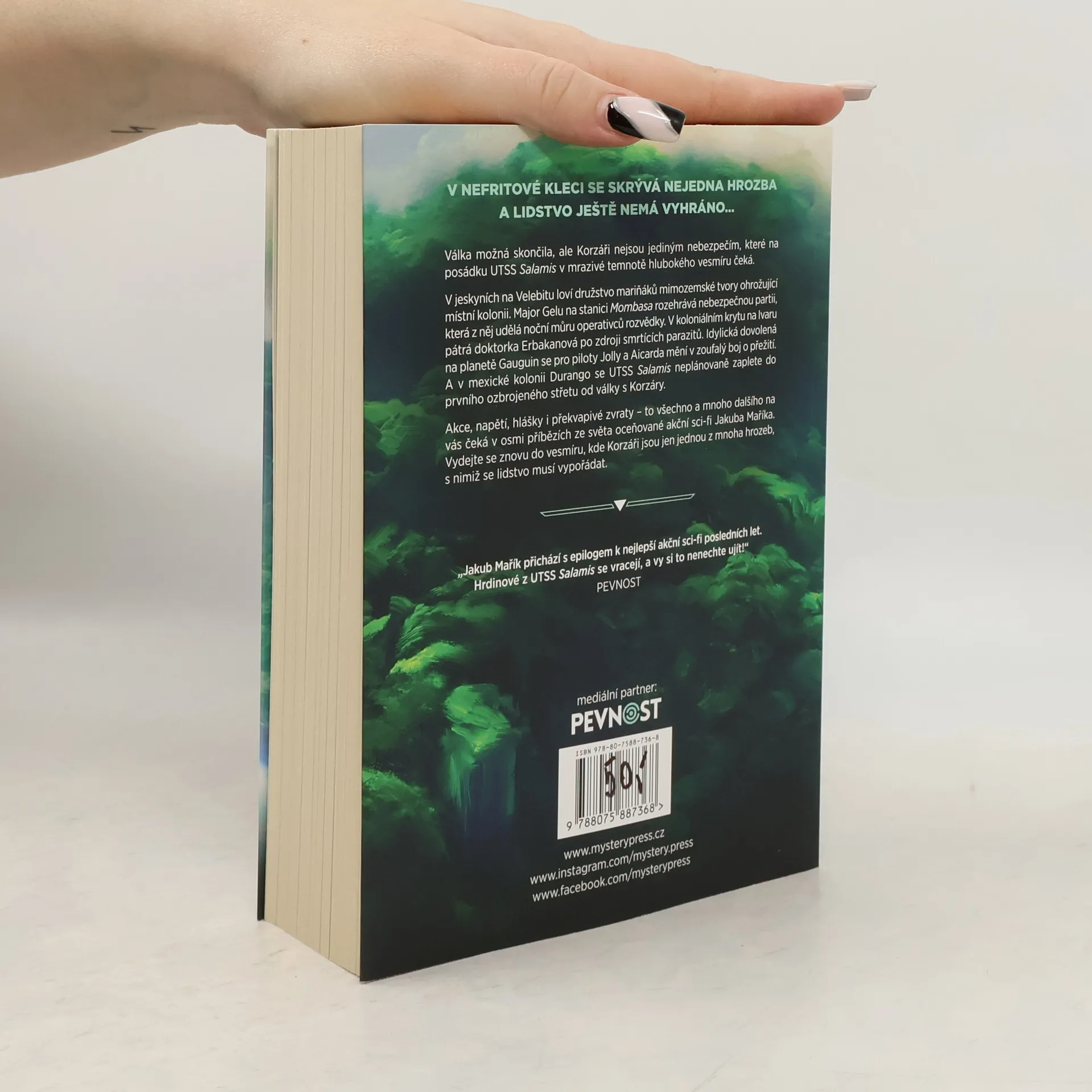 V NEFRITOVÉ KLECI SE SKRÝVÁ NEJEDNA HROZBA A LIDSTVO JEŠTĚ NEMÁ VYHRÁNO… Válka možná skončila, ale Korzáři nejsou jediným nebezpečím, které na posádku UTSS Salamis v mrazivé temnotě hlubokého vesmíru čeká. V jeskyních na Velebitu loví družstvo mariňáků mimozemské tvory ohrožující místní kolonii. Major Gelu na stanici Mombasa rozehrává nebezpečnou partii, která z něj udělá noční můru operativců rozvědky. V koloniálním krytu na Ivaru pátrá doktorka Erbakanová po zdroji smrtících parazitů. Idylická dovolená na planetě Gauguin se pro piloty Jolly a Aicarda mění v zoufalý boj o přežití. A v mexické kolonii Durango se UTSS Salamis neplánovaně zaplete do prvního ozbrojeného střetu od války s Korzáry. Akce, napětí, hlášky i překvapivé zvraty – to všechno a mnoho dalšího na vás čeká v sedmi příbězích ze světa oceňované akční sci-fi Jakuba Maříka. Vydejte se znovu do vesmíru, kde Korzáři jsou jen jednou z mnoha hrozeb, s nimiž se lidstvo musí vypořádat. ____ „Jakub Mařík přichází s epilogem k nejlepší akční sci-fi posledních let. Hrdinové z UTSS Salamis se vracejí, a vy si to nenechte ujít!“ – PEVNOST