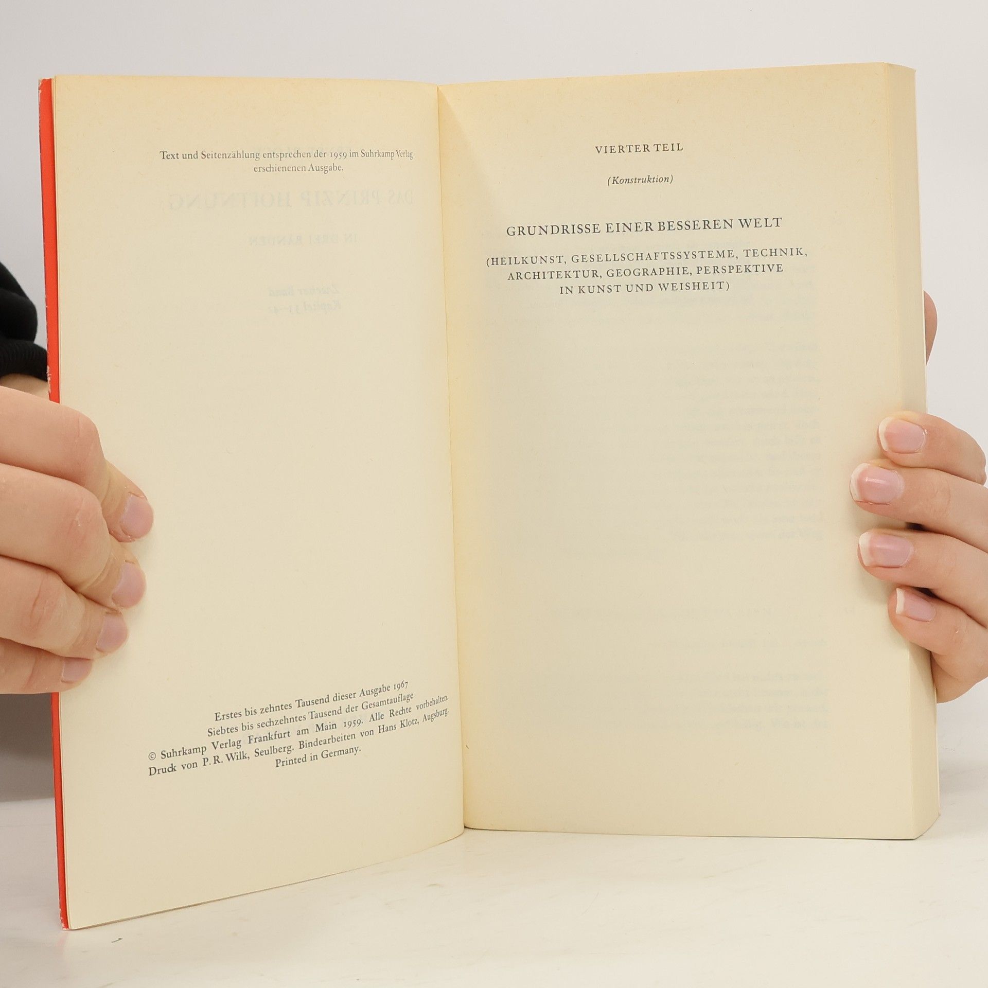 Vorwort ERSTER TEIL (BERICHT) - KLEINE TAGTRÄUME 1. Wir fangen leer an 2. Vieles schmeckt nach mehr 3. Täglich ins Blaue hinein 4. Versteck und schöne Fremde (Unter sich / Daheim schon unterwegs) 5. Flucht und die Rückkehr des Siegers (Ab zu Schiff / Die funkelnde Schale) 6. Reifere Wünsche und ihre Bilder (Die lahmen Gäule / Nacht der langen Messer / Kurz vor Torschluß / Erfindung eines neuen Vergnügens / Gelegenheit, freundlich zu sein) 7. Was im Alter zu wünschen übrig bleibt (Wein und Beutel / Heraufbeschworene Jugend; Gegenwunsch: Ernte / Abend und Haus) 8. Das Zeichen, das wendet ZWEITER TEIL (GRUNDLEGUNG) - DAS ANTIZIPIERENDE BEWUSSTSEIN 9. Was als Drängen vor sich geht 10. Nacktes Streben und Wünschen, nicht gesättigt. 11. Der Mensch als ziemlich umfängliches Triebwesen (Der einzelne Leib / Kein Trieb ohne Leib dahinter / Die wechselnde Leidenschaft) 12. Verschiedene Auffassungen vom menschlichen Grundtrieb (Der geschlechtliche Trieb / Ichtrieb und Verdrängung / Verdrängung, Komplex, Unbewußtes und die Sublimierung / Machttrieb, Rauschtrieb, Kollektiv-Unbewußtes / »Eros« und die Archetypen) 13. Die geschichtliche Begrenztheit aller Grundtriebe; verschiedene Lagen des Selbstinteresses; gefüllte und Erwartungs-Affekte (Der dringende Bedarf / Verläßlichster Grundtrieb: Selbsterhaltung / Geschichtlicher Wandel der Triebe, auch des Selbsterhaltungstriebs / Gemütsbewegung und Selbstzustand, Appetitus der Erwartungsaffekte, vorzüglich der Hoffnung / Selbsterweiterungstrieb nach vorwärts, tätige Erwartung) 14. Grundsätzliche Unterscheidung der Tagträume von den Nachtträumen. Versteckte und alte Wunscherfüllung im Nachttraum, ausfabelnde und antizipierende in den Tagphantasien (Neigung zum Traum / Träume als Wunscherfüllung / Angsttraum und Wunscherfüllung / Eine Hauptsache: Der Tagtraum ist keine Vorstufe des nächtlichen Traums / Erster und zweiter Charakter des Tagtraums: freie Fahrt, erhaltenes Ego / Dritter Charakter des Tagtraums: Weltverbesserung / Vierter Charakter des Tagtraums: Fahrt ans Ende / Ineinander nächtlicher und täglicher Traumspiele, seine Auflösung / Nochmals Neigung zum Traum: die »Stimmung« als Medium von Tagträumen / Nochmals die Erwartungsaffekte (Angst, Furcht, Schreck, Verzweiflung, Hoffnung, Zuversicht) und der Wachtraum) 15. Entdeckung des Noch-Nicht-Bewußten oder der Dämmerung nach Vorwärts. Noch-Nicht-Bewußtes als neue Bewußtseinsklasse und als Bewußtseinsklasse des Neuen: Jugend, Zeitwende, Produktivität. Begriff der utopischen Funktion, ihre Begegnung mit Interesse, Ideologie, Archetypen, Idealen, Allegorien-Symbolen (Die zwei Ränder / Doppelte Bedeutung des Vorbewußten / Noch-Nicht-Bewußtes in Jugend, Zeitwende, Produktivität / Weiteres zur Produktivität: ihre drei Stadien / Unterschiede des Widerstands, den das Vergessene und das Noch-Nicht-Bewußte der Erhellung entgegensetzen / Epilog über die Sperre, die den Begriff des Noch-Nicht-Bewußten so lange verhindert hat / Die bewußte und die gewußte Tätigkeit im Noch-Nicht-Bewußten, utopische Funktion / Weiter utopische Funktion: das Subjekt in ihr und der Gegenzug gegen das schlecht Vorhandene / Berührung der utopischen Funktion mit Interesse / Begegnung der utopischen Funktion mit Ideologie / Begegnung der utopischen Funktion mit Archetypen / Begegnung der utopischen Funktion mit Idealen / Begegnung der utopischen Funktion mit Allegorien-Symbolen) 16. Utopischer Bildrest in der Verwirklichung; ägyptische und trojanische Helena (Träume wollen ziehen / Nicht-Genügen und was darin stecken kann / Erster Grund der Enttäuschung: Dort, wo du nicht bist, dort ist das Glück; zweiter Grund: Verselbständigtet Traum und die Sage der doppelten Helena / Einwand gegen den ersten und zweiten Grund: Odyssee des Stilliegens / Dritter Grund der utopischen Restbilder: die Aporien der Verwirklichung) 17. Die Welt, worin utopische Phantasie ein Korrelat hat; reale Möglichkeit, die Kategorien Front, Novum, Ultimum und der Horizont (Der Mensch ist nicht dicht / Vieles in der Welt ist noch ungeschlossen / Militanter Optimismus, die Kategorien Front, Novum, Ultimum / Das »nach Möglichkeit« und das »in Möglichkeit Seiende;«, Kälte- und Wärmestrom im Marxismus / Künstlerischer Schein als sichtbarer Vor-Schein / Falsche Autarkie; Vor-Schein als reales Fragment / Es geht um den Realismus, alles Wirkliche hat einen Horizont) 18. Die Schichten der Kategorie Möglichkeit (Das formal Mögliche / Das sachlich-objektiv Mögliche / Das sachhart-objektgemäß Mögliche / Das objektiv-real Mögliche / Erinnerung: Logisch-statischer Kampf gegen das Mögliche / Möglichkeit verwirklichen) 19. Weltveränderung oder die Elf Thesen von Marx über Feuerbach (Zeit der Abfassung / Frage der Gruppierung / Erkenntnistheoretische Gruppe: Die Anschauung und Tätigkeit (Thesen 5, 1, 3) / Anthropologisch-historische Gruppe: Die Selbstentfremdung und der wahre Materialismus (Thesen 4, 6, 7, 9, 10) / Theorie-Praxis-Gruppe: Beweis und Bewährung (Thesen 2, 8) / Das Losungswort und sein Sinn (These 11) / Der archimedische Punkt; Wissen nicht nur auf Vergangenes, sondern wesentlich auf Heraufkommendes bezogen) 20. Zusammenfassung / Antizipatorische Beschaffenheit und ihre Pole: Dunkler Augenblick - Offene Adäquatheit (Puls und gelebtes Dunkel / Platz für möglichen Vormarsch / Quell und Mündung: das Staunen als absolute Frage / Nochmals: Dunkel des gelebten Augenblicks; Carpe diem / Dunkel des gelebten Augenblicks, Fortsetzung: Vordergrund, schädlicher Raum, Melancholie der Erfüllung, Selbstvermittlung / Nochmals Staunen als absolute Frage, in Angst- wie Glücksgestalt; der schlechthin utopische Archetyp: höchstes Gut / Das Nicht im Ursprung, das Noch-Nicht in der Geschichte, das Nichts oder aber das Alles am Ende / Utopie kein dauernder Zustand; also doch: Carpe diem, aber als echtes an echter Gegenwart) 21. Tagtraum in entzückender Gestalt: Pamina oder das Bild als erotisches Vers