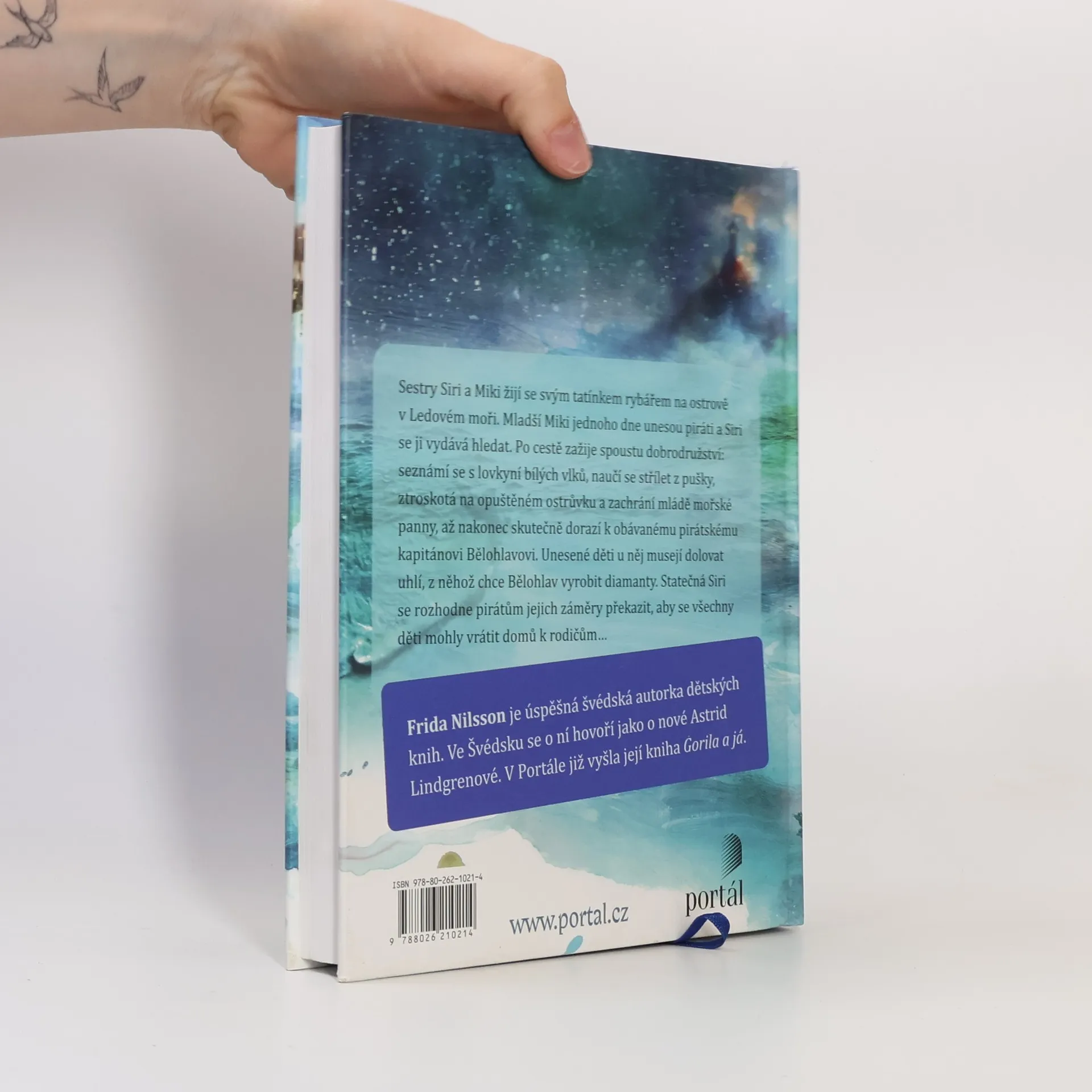 Sestry Siri a Miki žijí s tatínkem na ostrově v Ledovém moři. Mladší Miki jednoho dne unesou piráti a Siri se ji vydává hledat. Po cestě zažívá mnohá dobrodružství: pozná lovkyni bílých vlků, naučí se střílet z pušky, ztroskotá na ostrůvku a zachrání mládě mořské panny, až posléze konečně dorazí k pirátskému kapitánovi Bělovousovi. Piráti ji s dalšími unesenými dětmi přinutí pracovat v dole, kde se těží uhlí, z něhož chce Bělovous vyrobit diamanty. Siri se však nevzdává a ostatními dětmi nakonec kapitána společnými silami přemůžou. Všechny děti se vrátí domů k rodičům a i Siri s Miki se setkají s tatínkem. Napínavý příběh v duchu severské klasiky o dobrodružstvích dvou sourozenců se čte jedním dechem a rozvíjí čtenářovu fantazii. Určeno především pro děti ve věku 9–14 let. Frida Nilsson je úspěšná švédská autorka dětských knih. Vydala již jedenáct titulů, které byly přeloženy do řady jazyků. V roce 2014 získala cenu Astrid Lindgrenové a jako o nové Astrid Lindgrenové se o ní ve Švédsku hovoří. V Portále vyšla její knihy Gorila a já.