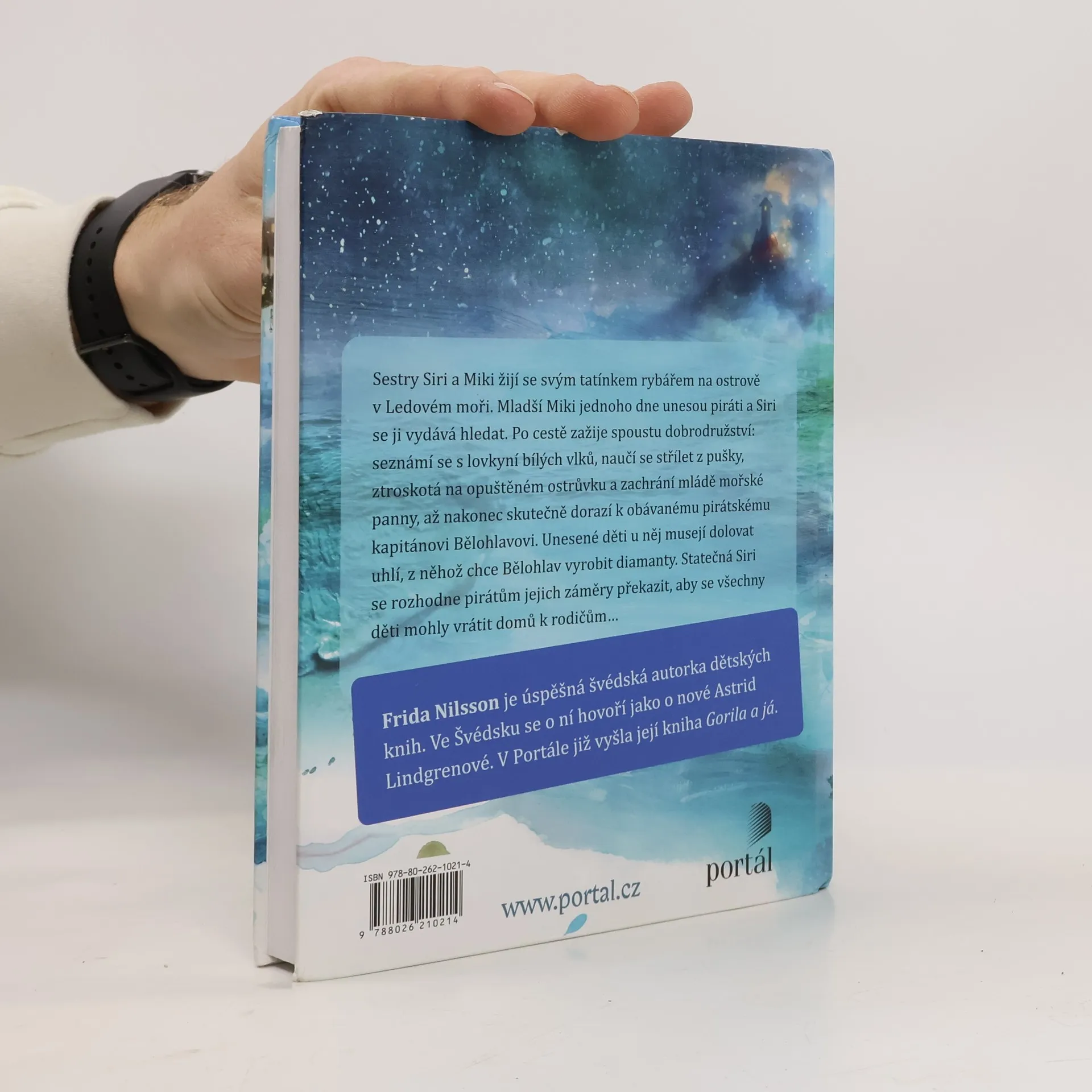 Sestry Siri a Miki žijí s tatínkem na ostrově v Ledovém moři. Mladší Miki jednoho dne unesou piráti a Siri se ji vydává hledat. Po cestě zažívá mnohá dobrodružství: pozná lovkyni bílých vlků, naučí se střílet z pušky, ztroskotá na ostrůvku a zachrání mládě mořské panny, až posléze konečně dorazí k pirátskému kapitánovi Bělovousovi. Piráti ji s dalšími unesenými dětmi přinutí pracovat v dole, kde se těží uhlí, z něhož chce Bělovous vyrobit diamanty. Siri se však nevzdává a ostatními dětmi nakonec kapitána společnými silami přemůžou. Všechny děti se vrátí domů k rodičům a i Siri s Miki se setkají s tatínkem. Napínavý příběh v duchu severské klasiky o dobrodružstvích dvou sourozenců se čte jedním dechem a rozvíjí čtenářovu fantazii. Určeno především pro děti ve věku 9–14 let. Frida Nilsson je úspěšná švédská autorka dětských knih. Vydala již jedenáct titulů, které byly přeloženy do řady jazyků. V roce 2014 získala cenu Astrid Lindgrenové a jako o nové Astrid Lindgrenové se o ní ve Švédsku hovoří. V Portále vyšla její knihy Gorila a já.