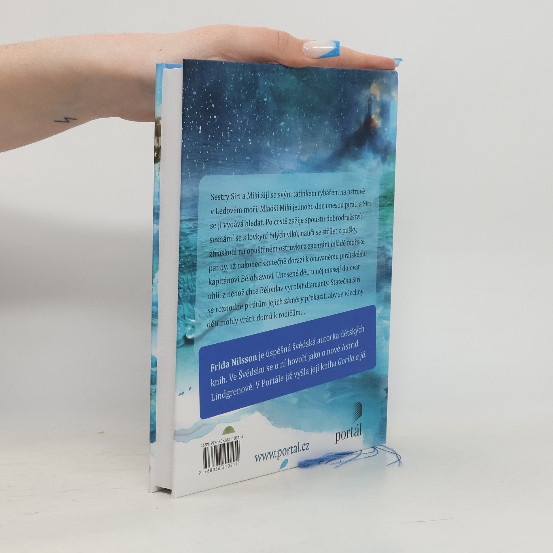 Sestry Siri a Miki žijí s tatínkem na ostrově v Ledovém moři. Mladší Miki jednoho dne unesou piráti a Siri se ji vydává hledat. Po cestě zažívá mnohá dobrodružství: pozná lovkyni bílých vlků, naučí se střílet z pušky, ztroskotá na ostrůvku a zachrání mládě mořské panny, až posléze konečně dorazí k pirátskému kapitánovi Bělovousovi. Piráti ji s dalšími unesenými dětmi přinutí pracovat v dole, kde se těží uhlí, z něhož chce Bělovous vyrobit diamanty. Siri se však nevzdává a ostatními dětmi nakonec kapitána společnými silami přemůžou. Všechny děti se vrátí domů k rodičům a i Siri s Miki se setkají s tatínkem. Napínavý příběh v duchu severské klasiky o dobrodružstvích dvou sourozenců se čte jedním dechem a rozvíjí čtenářovu fantazii. Určeno především pro děti ve věku 9–14 let. Frida Nilsson je úspěšná švédská autorka dětských knih. Vydala již jedenáct titulů, které byly přeloženy do řady jazyků. V roce 2014 získala cenu Astrid Lindgrenové a jako o nové Astrid Lindgrenové se o ní ve Švédsku hovoří. V Portále vyšla její knihy Gorila a já.
