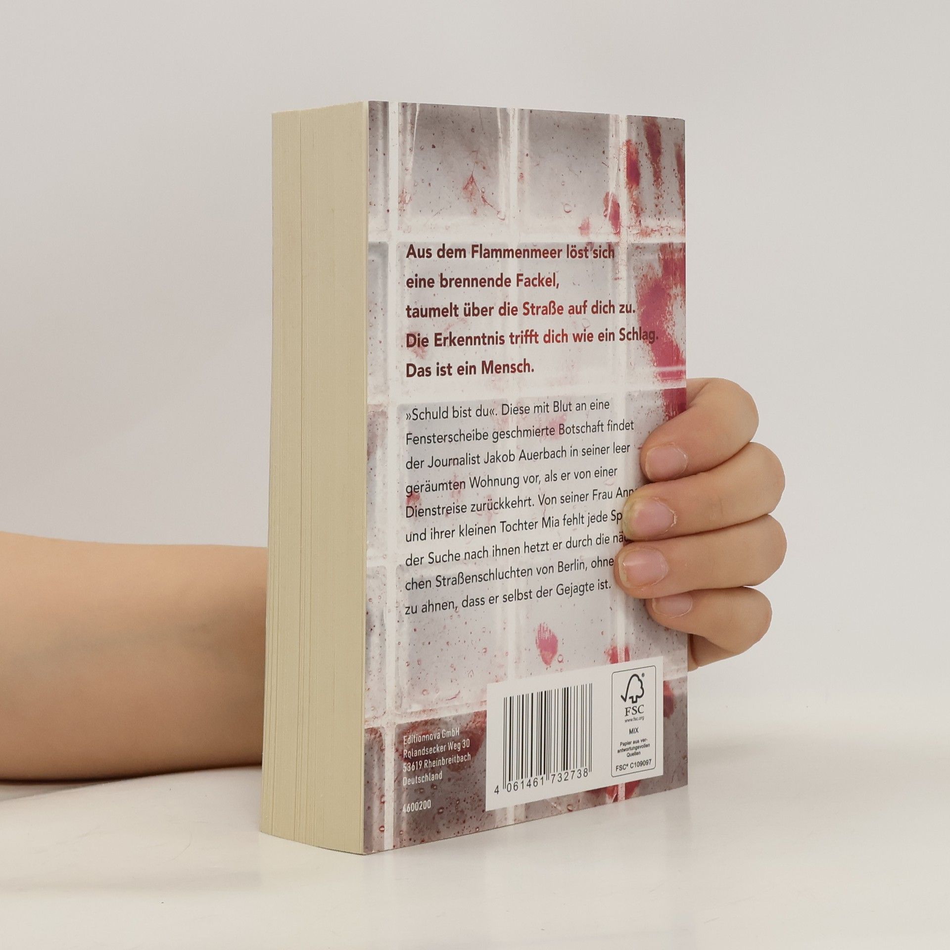 Aus dem Flammenmeer löst sich eine brennende Fackel, taumelt über die Straße auf dich zu. Die Erkenntnis trifft dich wie ein Schlag. Das ist ein Mensch. Schuld bist du – Diese mit Blut an eine Fensterscheibe geschmierte Botschaft findet der Journalist Jakob Auerbach in seiner leergeräumten Wohnung vor, als er von einer Dienstreise zurückkehrt. Von seiner Frau Anne und der kleinen Tochter Mia fehlt jede Spur. Auf der Suche nach ihnen hetzt er durch die nächtlichen Straßenschluchten von Berlin, ohne zu ahnen, dass er selbst der Gejagte ist.