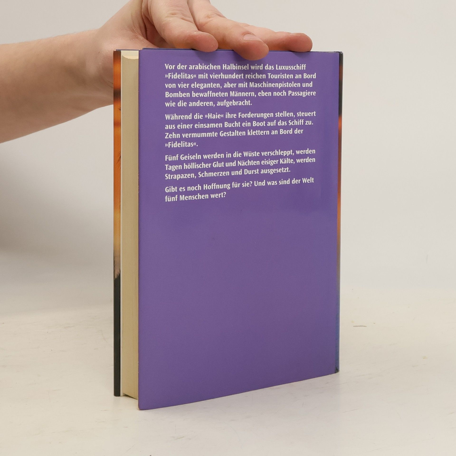 Vor der arabischen Halbinsel wird das Luxusschiff »Fidelitas« mit vierhundert reichen Touristen an Bord von vier eleganten, aber mit Maschinenpistolen und Bomben bewaffneten Männern, eben noch Passagiere wie die anderen, aufgebracht. Während die »Haie« ihre Forderungen stellen, steuert aus einer einsamen Bucht ein Boot das Schiff zu. Zehn vermummte Gestalten klettern an Bord der »Fidelitas«. Fünf Geiseln warden in die Wüste verschleppt, warden Tagen höllischer Glut und Nächten eisiger Kälte, warden Strapazen Schmerzen und Durst ausgesetzt. Gibt es noch Hoffnung für sie? Und was sind der Welt fünf Menschen wert?