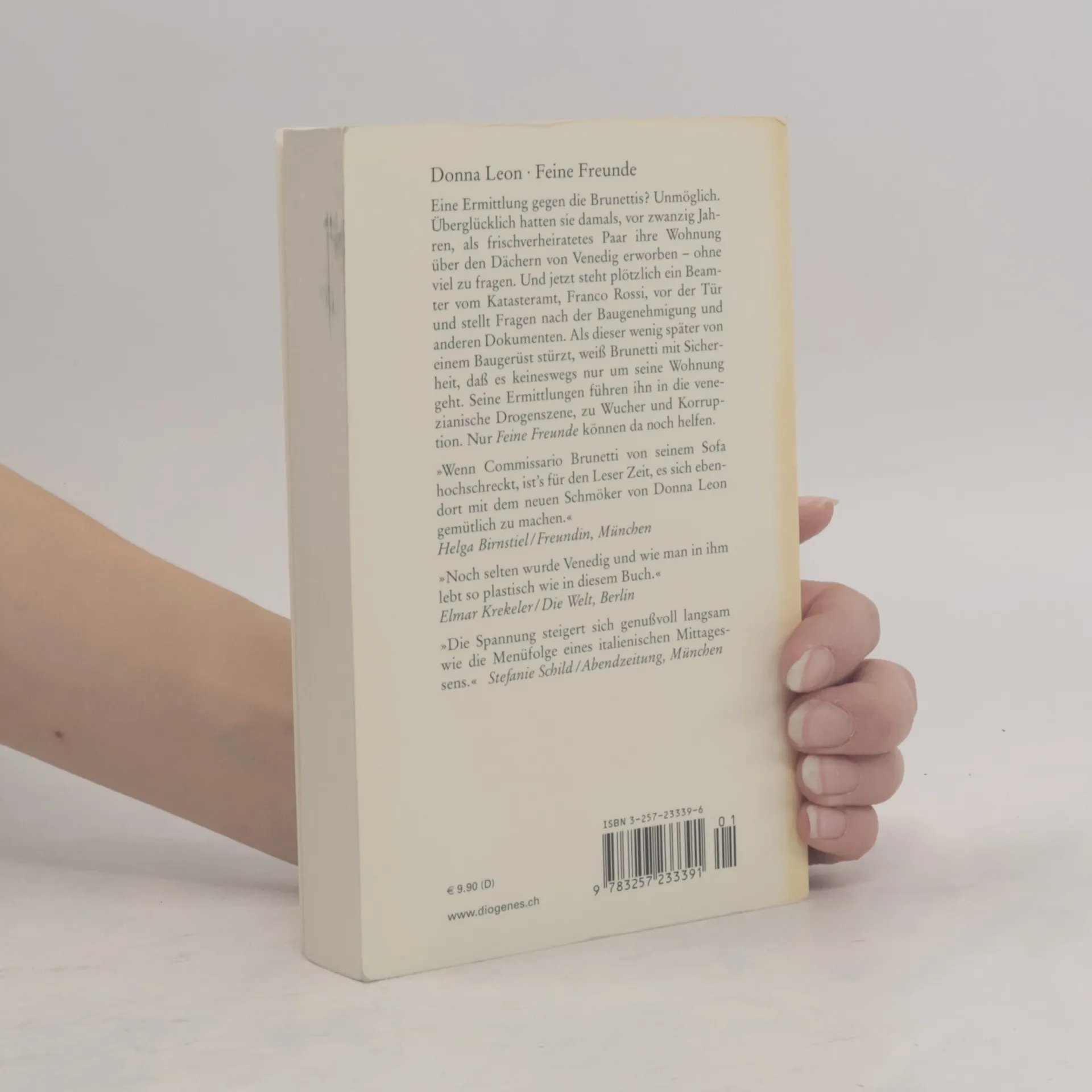 Eine Ermittlung gegen Brunetti? Unmöglich. Zwar geht es nur um seine Eigentumswohnung und die Baubewilligung, doch Brunetti muß das Schlimmste befürchten. Als der zuständige Beamte wenig später von einem Baugerüst stürzt, weiß Brunetti mit Sicherheit, daß es in diesem Fall keineswegs nur um seine eigene Wohnung geht. Seine Ermittlungen führen Brunetti in die venezianische Drogenszene, zu Wucher und Korruption. Nur Feine Freunde können da noch helfen.
