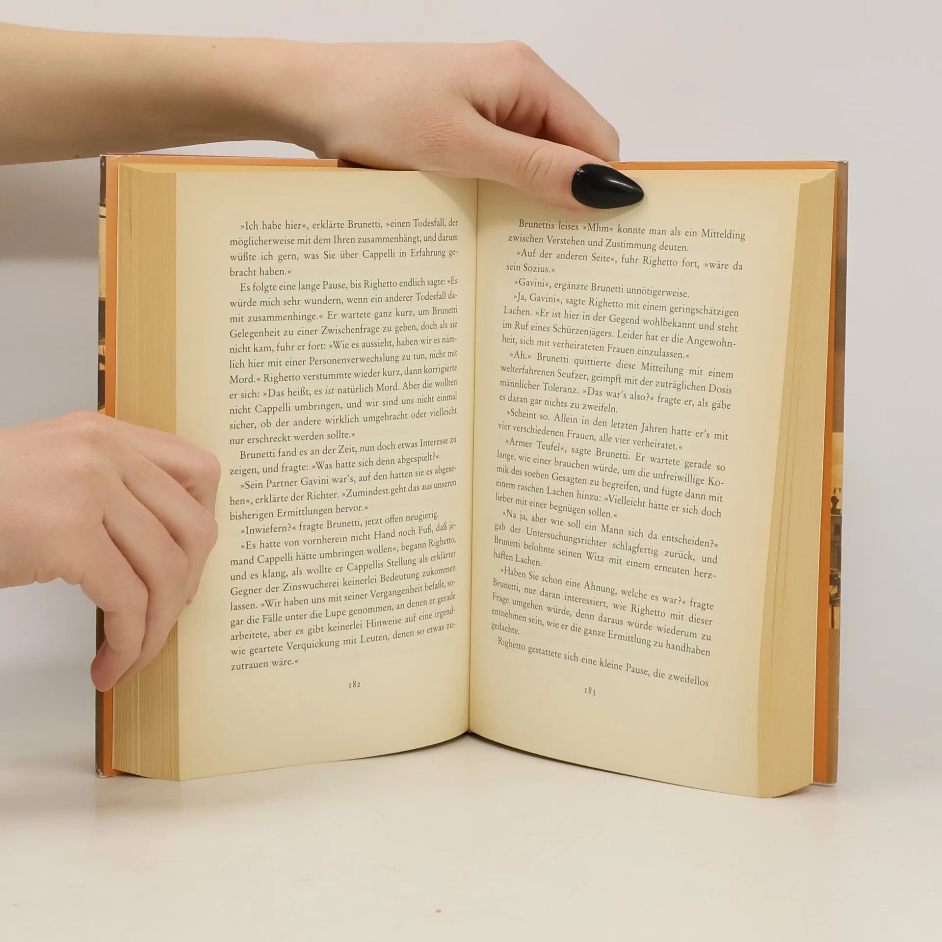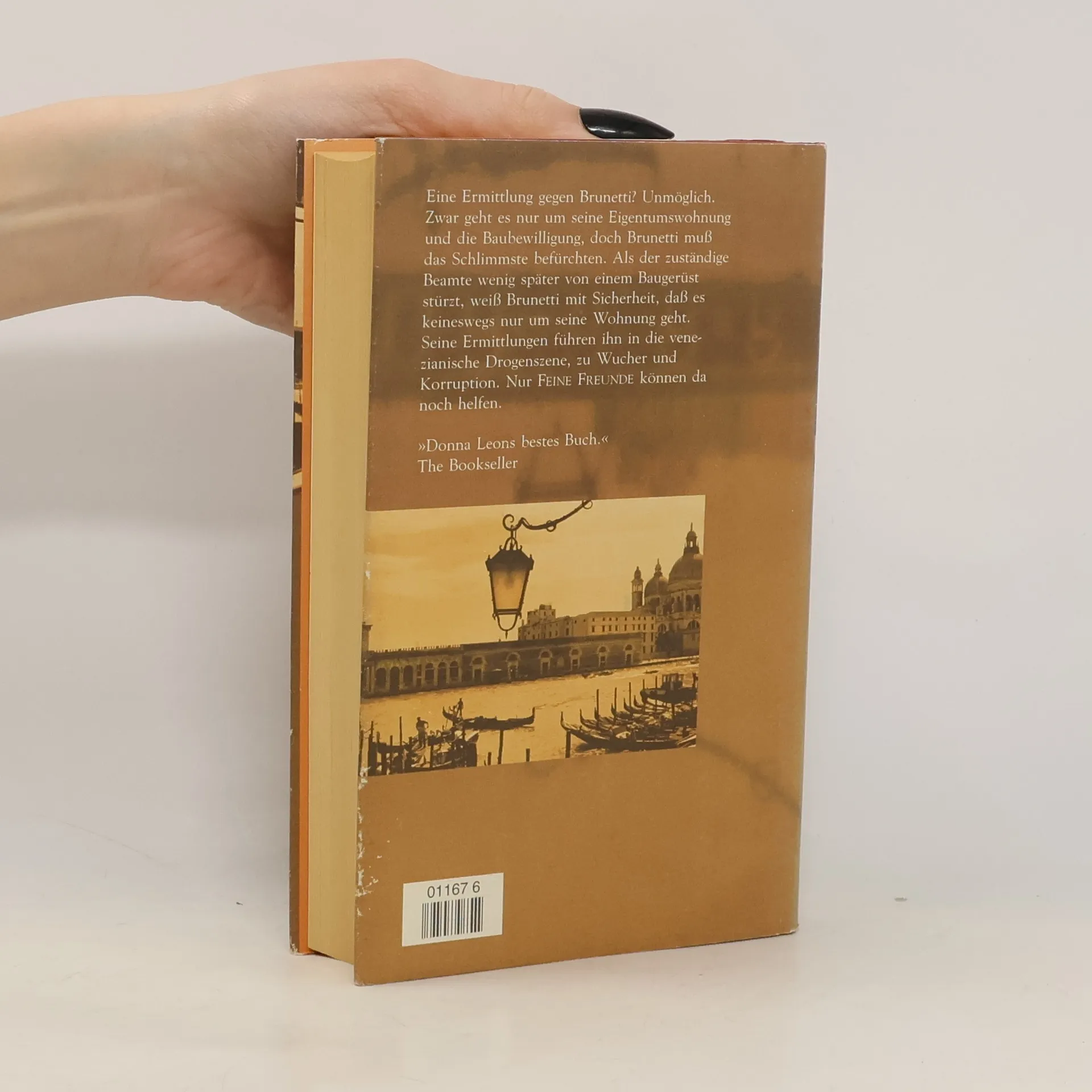 Eine Ermittlung gegen Brunetti? Unmöglich. Zwar geht es nur um seine Eigentumswohnung und die Baubewilligung, doch Brunetti muß das Schlimmste befürchten. Als der zuständige Beamte wenig später von einem Baugerüst stürzt, weiß Brunetti mit Sicherheit, dass es keineswegs nur um seine Wohnung geht. Seine Ermittlungen führen ihn in die venezianische Drogenszene, zu Wucher und Korruption. Nur FEINE FREUNDE können da noch helfen.