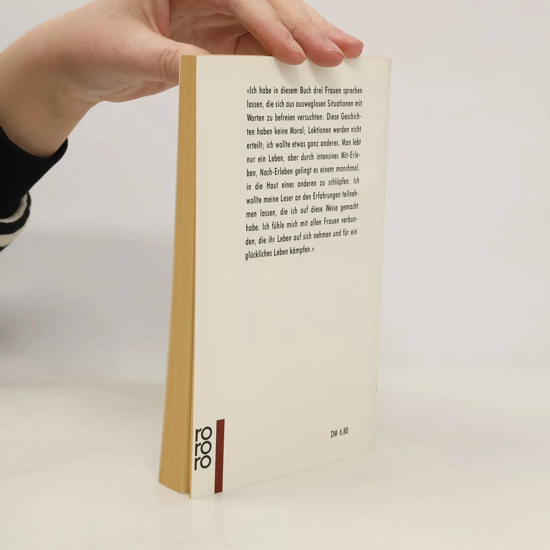 «Ich habe in diesem Buch drei Frauen sprechen lassen, die sich aus ausweglosen Situationen mit Worten zu befreien versuchten: Diese Geschichten haben keine Moral; Lektionen werden nicht erteilt; ich wollte etwas ganz anderes. Man lebt nur ein Leben, aber durch intensives Mit-Erleben, Nach-Erleben gelingt es einem manchmal, in die Haut eines anderen zu schlüpfen. Ich wollte meine Leser an den Erfahrungen teilnehmen lassen, die ich auf diese Weise gemacht habe. Ich fühle mich mit allen Frauen verbunden, die ihr Leben auf sich nehmen und für ein glückliches Leben kämpfen.»
