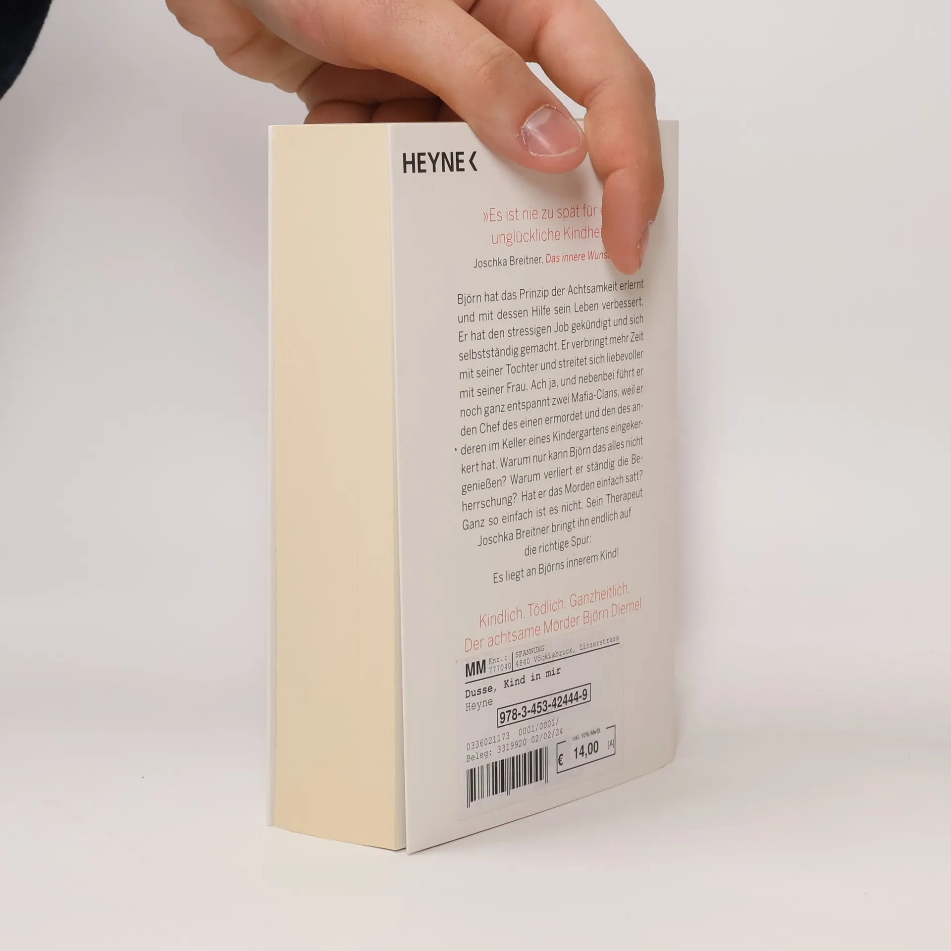 Björn Diemel ist zurück – und mordet ganzheitlicher als je zuvor Björn Diemel hat die Prinzipien der Achtsamkeit erlernt, und mit ihrer Hilfe sein Leben verbessert. Er hat den stressigen Job gekündigt und sich selbstständig gemacht. Er verbringt mehr Zeit mit seiner Tochter und streitet sich in der Regel liebevoller mit seiner Frau. Ach ja, und nebenbei führt er noch ganz entspannt zwei Mafia-Clans, weil er den Chef des einen ermordet und den des anderen im Keller eines Kindergartens eingekerkert hat. Warum nur kann Björn das alles nicht genießen? Warum verliert er ständig die Beherrschung? Hat er das Morden einfach satt? Ganz so einfach ist es nicht. Sein Therapeut Joschka Breitner bringt ihn endlich auf die richtige Spur: Es liegt an Björns innerem Kind!