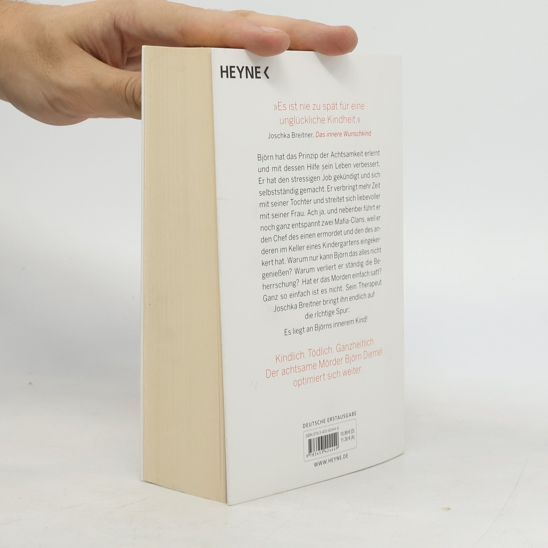 Björn Diemel ist zurück – und mordet ganzheitlicher als je zuvor Björn Diemel hat die Prinzipien der Achtsamkeit erlernt, und mit ihrer Hilfe sein Leben verbessert. Er hat den stressigen Job gekündigt und sich selbstständig gemacht. Er verbringt mehr Zeit mit seiner Tochter und streitet sich in der Regel liebevoller mit seiner Frau. Ach ja, und nebenbei führt er noch ganz entspannt zwei Mafia-Clans, weil er den Chef des einen ermordet und den des anderen im Keller eines Kindergartens eingekerkert hat. Warum nur kann Björn das alles nicht genießen? Warum verliert er ständig die Beherrschung? Hat er das Morden einfach satt? Ganz so einfach ist es nicht. Sein Therapeut Joschka Breitner bringt ihn endlich auf die richtige Spur: Es liegt an Björns innerem Kind!