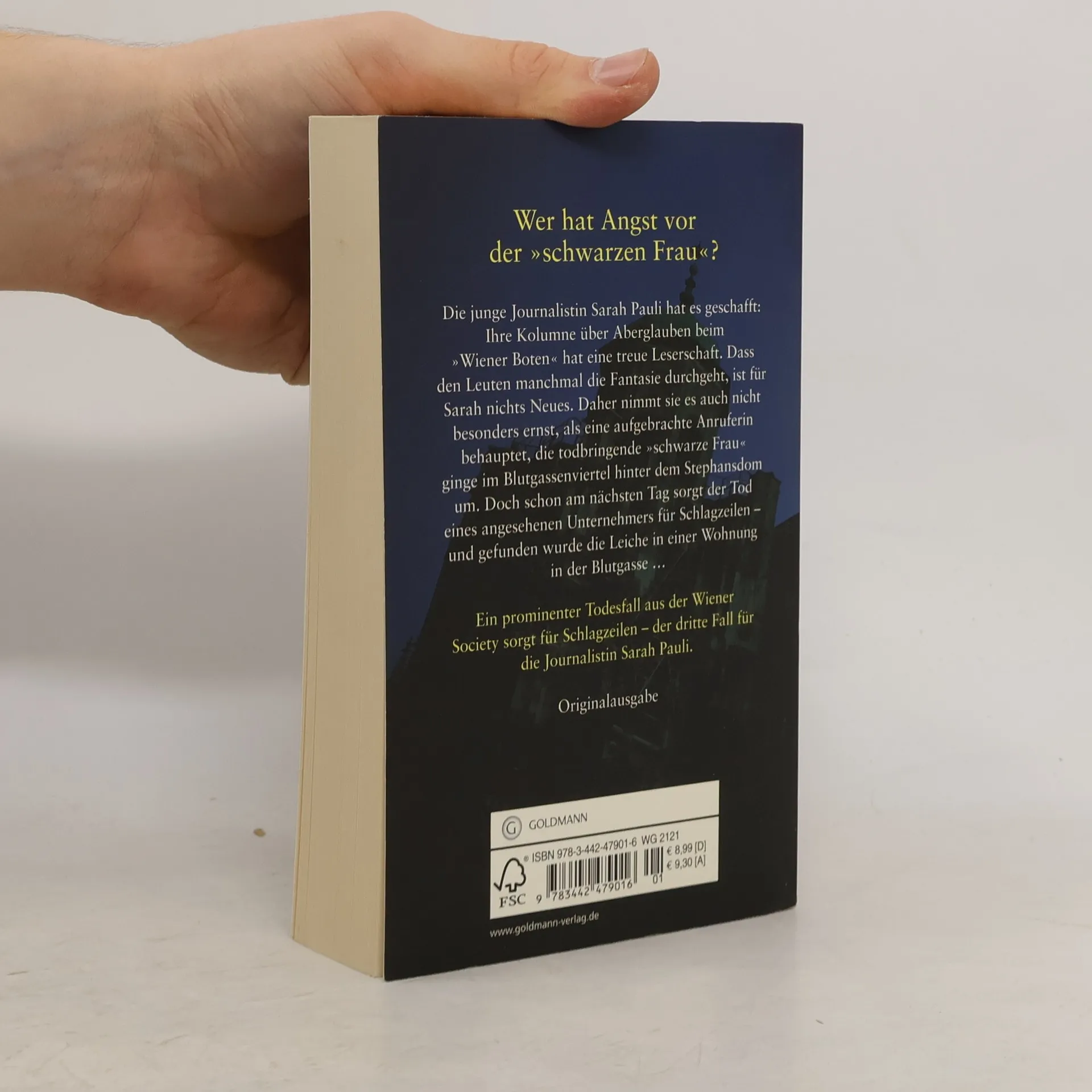 Ein Todesfall aus der Wiener Society sorgt für Schlagzeilen ... Die junge Journalistin Sarah Pauli hat es geschafft: Ihre Kolumne über Aberglauben beim „Wiener Boten“ hat eine treue Leserschaft. Dass den Leuten manchmal die Fantasie durchgeht, ist für Sarah nichts Neues, daher nimmt sie es auch nicht besonders ernst, als eine aufgebrachte Anruferin behauptet, die todbringende „schwarze Frau“ ginge im Blutgassenviertel hinter dem Stephansdom um. Doch schon am nächsten Tag sorgt der Tod eines angesehenen Unternehmers für Schlagzeilen – und gefunden wurde die Leiche in einer Wohnung in der Blutgasse …
