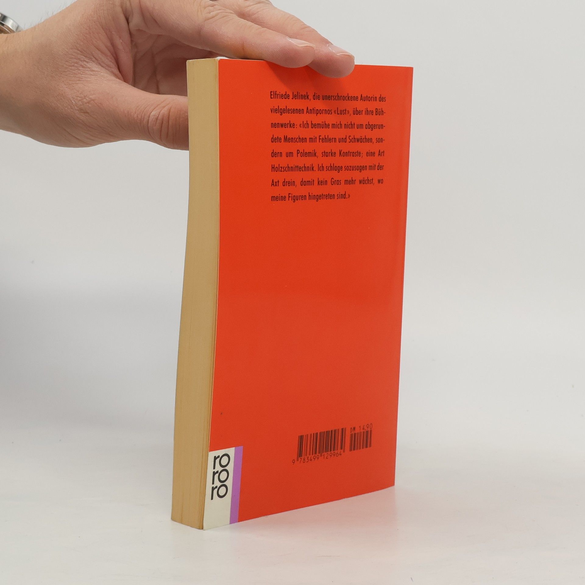 «Ich bemühe mich nicht um abgerundete Menschen mit Fehlern und Schwächen, sondern um Polemik, starke Kontraste; eine Art Holzschnitttechnik. Ich schlage sozusagen mit der Axt drein, damit kein Gras mehr wächst, wo meine Figuren hingetreten sind.» (Elfriede Jelinek über ihre Bühnenwerke)