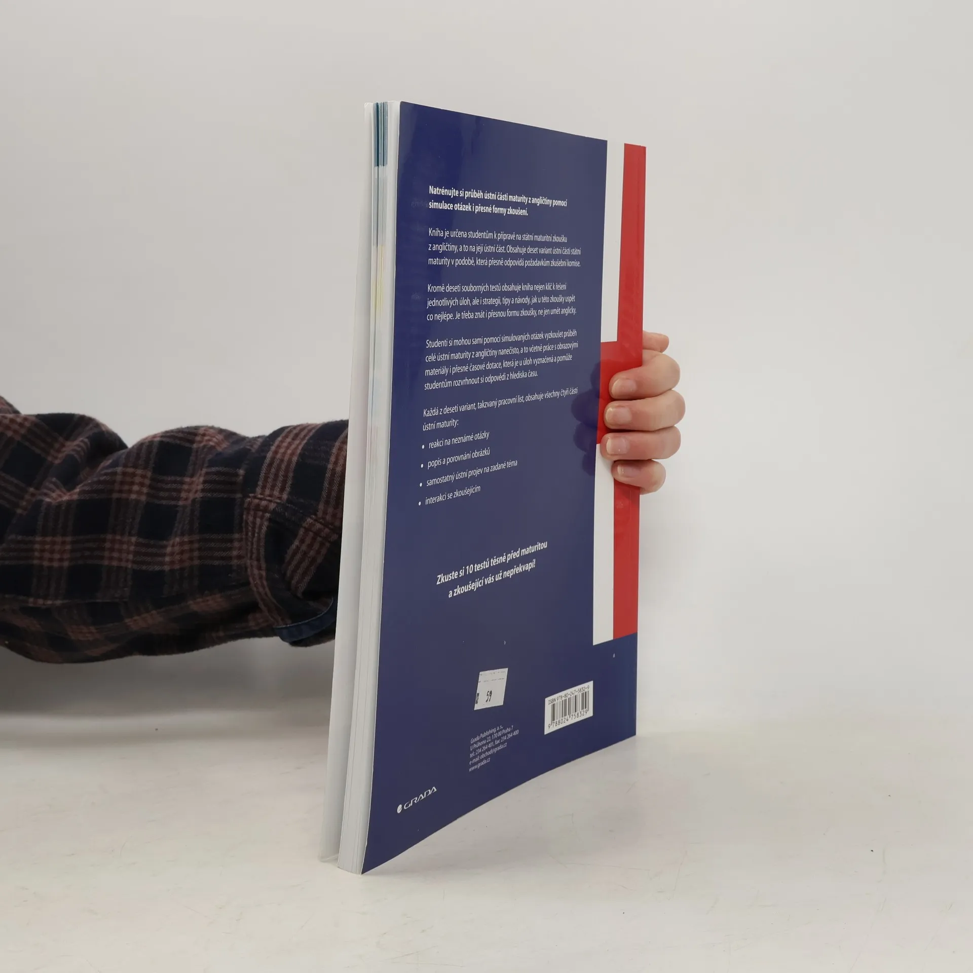 Natrénujte si průběh ústní části maturity z angličtiny pomocí simulace otázek i přesné formy zkoušení. Kniha je určena studentům k přípravě na státní maturitní zkoušku z angličtiny, a to na její ústní část. Obsahuje deset variant ústní části státní maturity v podobě, která přesně odpovídá požadavkům zkušební komise. Kromě deseti souborných testů obsahuje kniha nejen klíč k řešení jednotlivých úloh, ale i strategii, tipy a návody, jak u této zkoušky uspět co nejlépe. Je třeba znát i přesnou formu zkoušky, ne jen umět anglicky. Studenti si mohou sami pomocí simulovaných otázek vyzkoušet průběh celé ústní maturity z angličtiny nanečisto, a to včetně práce s obrazovými materiály i přesné časové dotace, která je u úloh vyznačená a pomůže studentům rozvrhnout si odpovědi z hlediska času. Každá z deseti variant, takzvaný pracovní list, obsahuje všechny čtyři části ústní maturity: • reakci na neznámé otázky • popis a porovnání obrázků • samostatný ústní projev na zadané téma • interakci se zkoušejícím Zkuste si 10 testů těsně před maturitou a zkoušející vás už nepřekvapí!