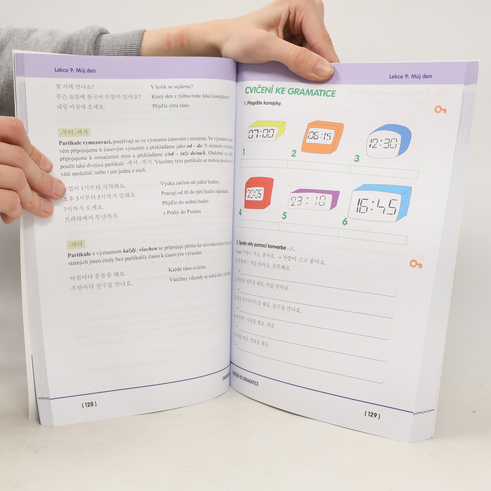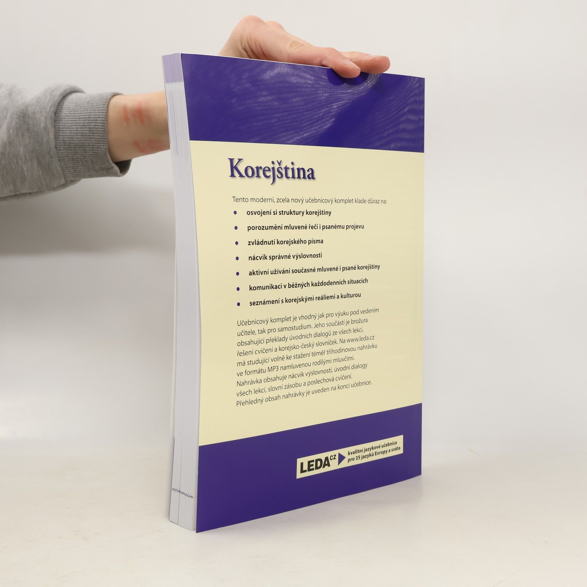 Moderní učebnice zaměřená na porozumění mluvené řeči i psanému projevu, zvládnutí písma, komunikaci v každodenních situacích.Učebnicový komplet je vhodný jak pro výuku pod vedením učitele, tak pro samostudium. Jeho součástí je brožura obsahující překlady úvodních dialogů ze všech lekcí, řešení cvičení a korejsko-český slovníček. Na www.leda.cz má studující volně ke stažení téměř tříhodinovou nahrávku ve formátu MP3 namluvenou rodilými mluvčími.