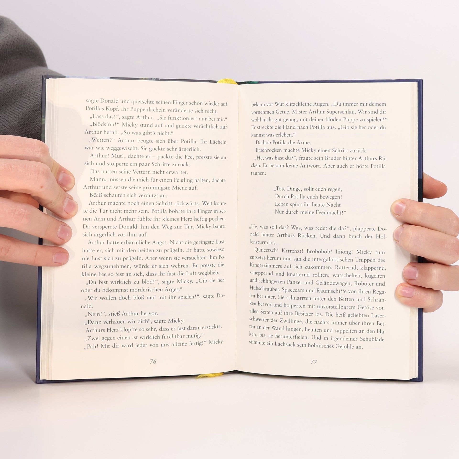 Arthur traut seinen Augen nicht. In dem schmutzigen Strumpf, den er im Wald gefunden hat, steckt jemand Lebendiges! Potilla, die Feenkönigin, ist nur puppengroß und elfenzart, doch als sie wieder bei Sinnen ist, hat sie sogleich einen Auftrag für Arthur. Ihr Volk ist überfallen worden und der Dieb hat sämtliche Feenmützen gestohlen. Jetzt können die Feen nicht in ihr Reich zurück. Arthur soll ihr helfen, die Mützen wieder zurückzuholen, und von nun an hat er keine ruhige Minute mehr …