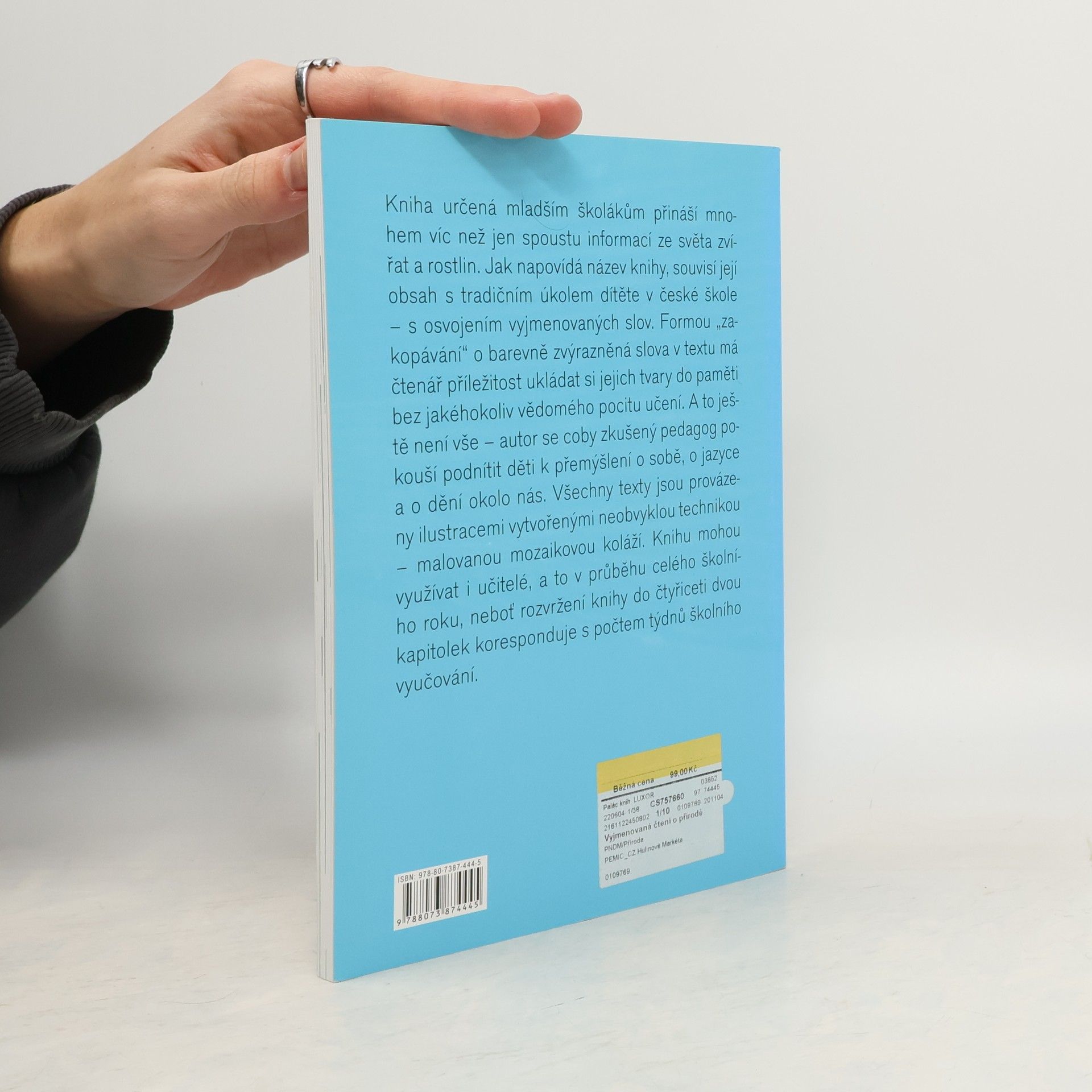 Kniha určená mladším školákům přináší mnohem víc než jen spoustu informací ze světa zvířat a rostlin. Jak napovídá název knihy, souvisí její obsah s tradičním úkolem dítěte v české škole – s osvojením vyjmenovaných slov. Formou „zakopávání“ o barevně zvýrazněná slova v textu má čtenář příležitost ukládat si jejich tvary do paměti bez jakéhokoliv vědomého pocitu učení. A to ještě není vše – autor se coby zkušený pedagog pokouší podnítit děti k přemýšlení o sobě, o jazyce a o dění okolo nás. Všechny texty jsou provázeny ilustracemi vytvořenými neobvyklou technikou – malovanou mozaikovou koláží. Knihu mohou využívat i učitelé, a to v průběhu celého školního roku, neboť rozvržení knihy do čtyřiceti dvou kapitolek koresponduje s počtem týdnů školního vyučování.