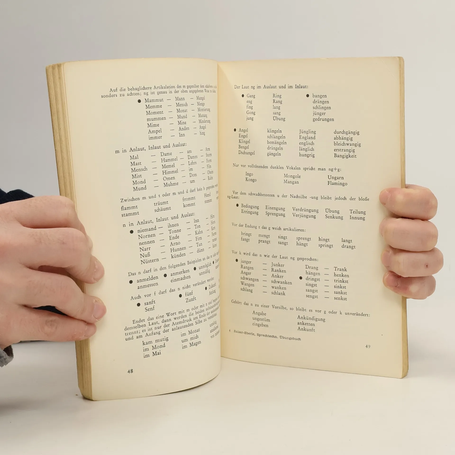 Dieses von Vera Balser-Eberle geschriebene Übungsbuch ist ein Standardwerk der deutschen Ausspracheschulung. Es will sowohl den Lernenden als auch den Lehrer in seinen Bemühungen um ein richtig gesprochenes Deutsch und um die Kräftigung der Stimme unterstützen. Die Übungen setzen sich zusammen aus Gegenüberstellungen ähnlich klingender Wörter, aus einfachen Sätzen, in denen die z. T. vorher geübten Wörter im Zusammenhang erscheinen, aus Rufübungen u. v. m.