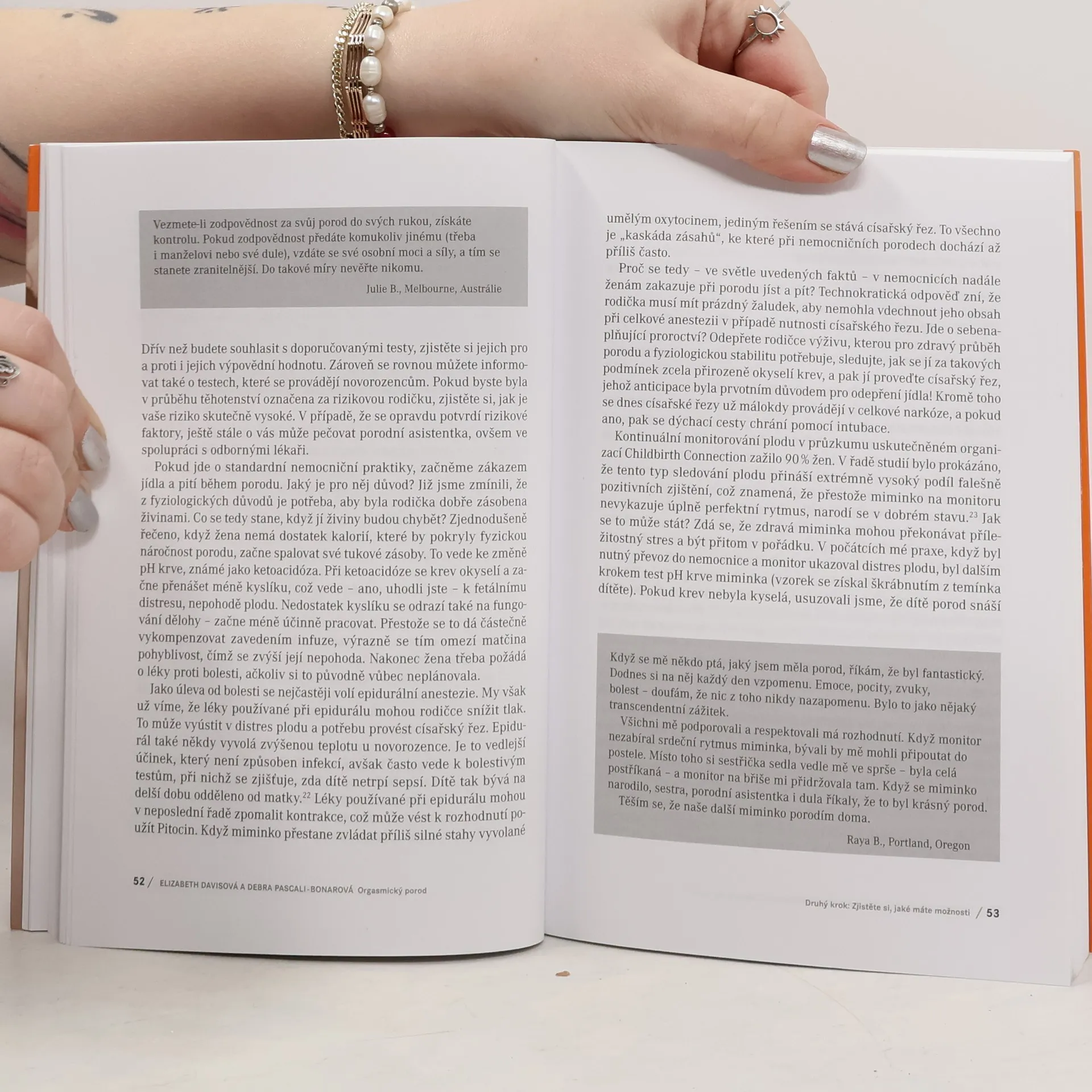 Kniha, která vám může otevřít oči a úplně změnit přístup k rození a možná i k vlastnímu životu. Odbornice na slovo vzaté, porodní asistentka a autorka učebnice pro porodní asistentky Elizabeth Davisová a zkušená dula a lektorka Debra Pascali-Bonarová, ukazují, že porod je možné prožít jako příjemnou až slastnou a extatickou, zásadně posilující událost, která ženě dodá sílu a odhodlání nejen pro následující roky mateřství. Orgasmický porod je přehledným průvodcem těhotenstvím a porodem. Přináší podrobný návod, jak se na porod, který je součástí sexuálního života ženy, připravit. Klade důraz na informovanost, zdravou životosprávu, sexualitu, odbourání stresu a vyrovnání se s traumaty. Kniha ženám (i jejich partnerům) dodá sebevědomí, potřebné informace podložené vědeckými výzkumy i životními zkušenostmi autorek a mnoha rodiček. Čtenářky podpoří, aby nejen své porody, ale i svůj život vzaly do svých rukou. Teoretickou část doprovázejí inspirativní porodní příběhy.