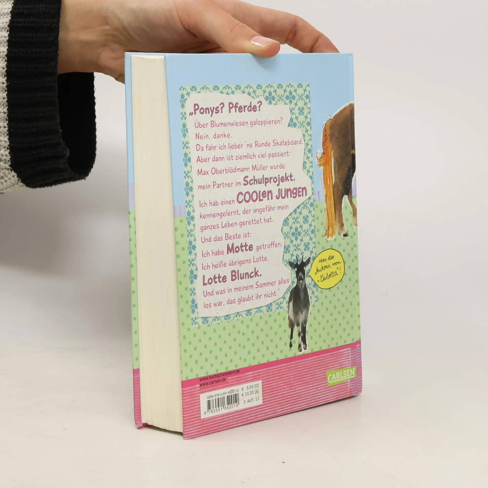 "Ponys? Pferde? Über Blumenwiesen galoppieren? Nein, danke. Ich fahr lieber 'ne Runde Skateboard. Aber dann ist ziemlich viel passiert: Max Oberblödmann Müller wurde mein Partner im Schulprojekt. Ich habe einen coolen Jungen kennengelernt, der ungefähr mein ganzes Leben gerettet hat. Und das Beste: Ich habe Motte getroffen. Ich heiße übrigens Lotte, Lotte Blunck. Und was in meinem Sommer alles los war, das glaubt ihr nicht.„ Nach “Carlotta" die neue Heldin von Dagmar Hoßfeld!