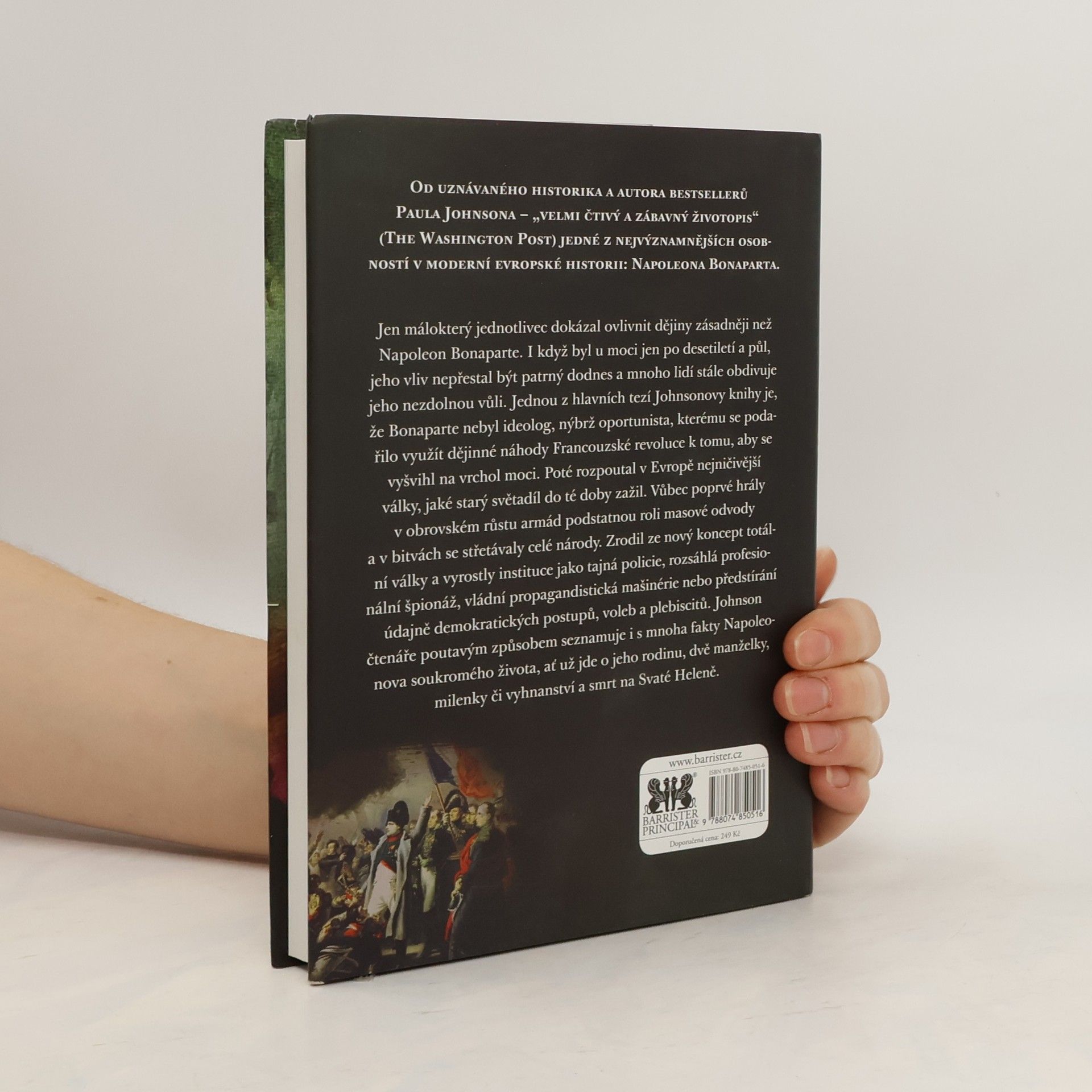 Jen málokterý jednotlivec dokázal ovlivnit dějiny zásadněji než Napoleon Bonaparte. I když byl u moci jen po desetiletí a půl, jeho vliv nepřestal být patrný dodnes a mnoho lidí stále obdivuje jeho nezdolnou vůli. Jednou z hlavních tezí Johnsonovy knihy je, že Bonaparte nebyl ideolog, nýbrž oportunista, kterému se podařilo využít dějinné náhody Francouzské revoluce k tomu, aby se vyšvihl na vrchol moci. Poté rozpoutal v Evropě nejničivější války, jaké starý světadíl do té doby zažil. Vůbec poprvé hrály v obrovském růstu armád podstatnou roli masové odvody a v bitvách se střetávaly celé národy. Zrodil ze nový koncept totální války a vyrostly instituce jako tajná policie, rozsáhlá profesionální špionáž, vládní propagandistická mašinérie nebo předstírání údajně demokratických postupů, voleb a plebiscitů. Johnson čtenáře poutavým způsobem seznamuje i s mnoha fakty Napoleonova soukromého života, ať už jde o jeho rodinu, dvě manželky, milenky či vyhnanství a smrt na Svaté Heleně. 2. vydání