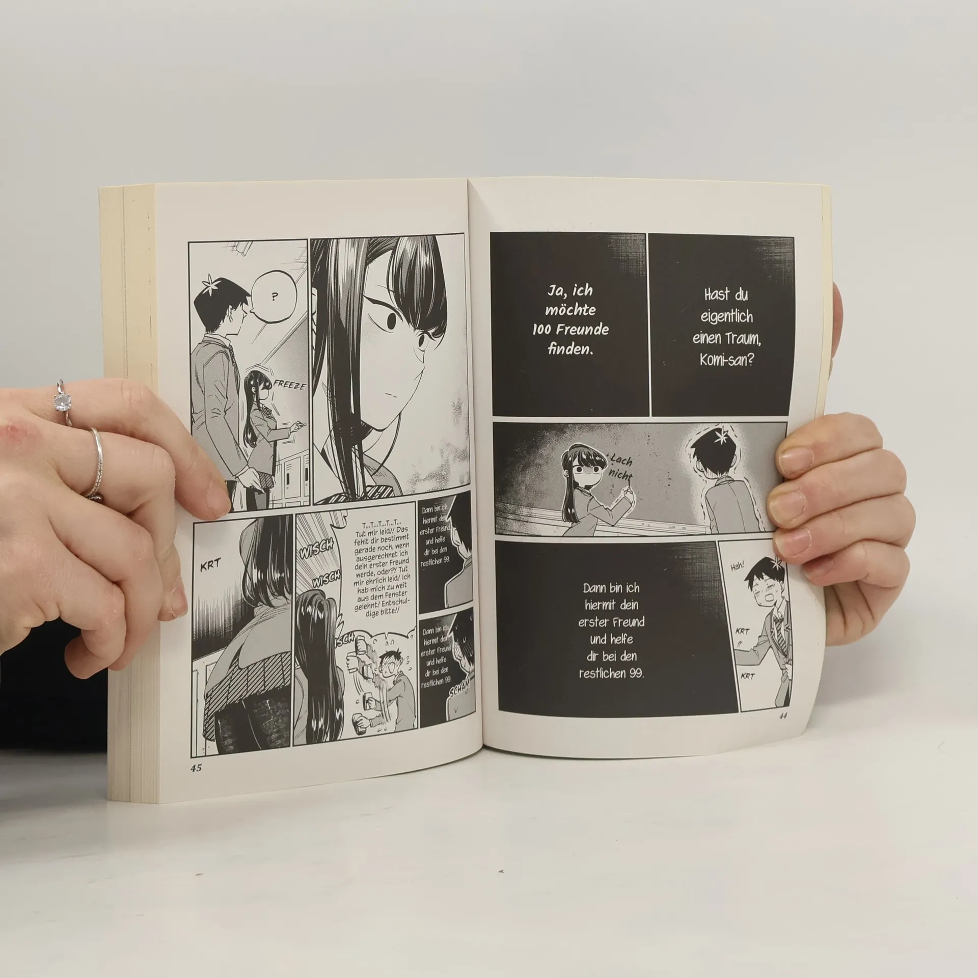 Komi ist der absolute Star ihrer Schule: So schön und kühl, dass jeder sie aus der Ferne bewundert. Aber ihr neuer Mitschüler Tadano findet heraus, dass der Schein ganz gewaltig trügt. Denn in Wahrheit fürchtet Komi sich so sehr vor anderen Menschen, dass sie keinen Ton herausbekommt. Mit Tadanos Hilfe versucht sie, ihre Ängste zu überwinden und ihren großen Traum zu erfüllen, 100 Freunde zu finden. Aber es gibt ein Problem, von dem die beiden noch nichts ahnen: An der Schule tummeln sich ausschließlich exzentrische Charaktere …