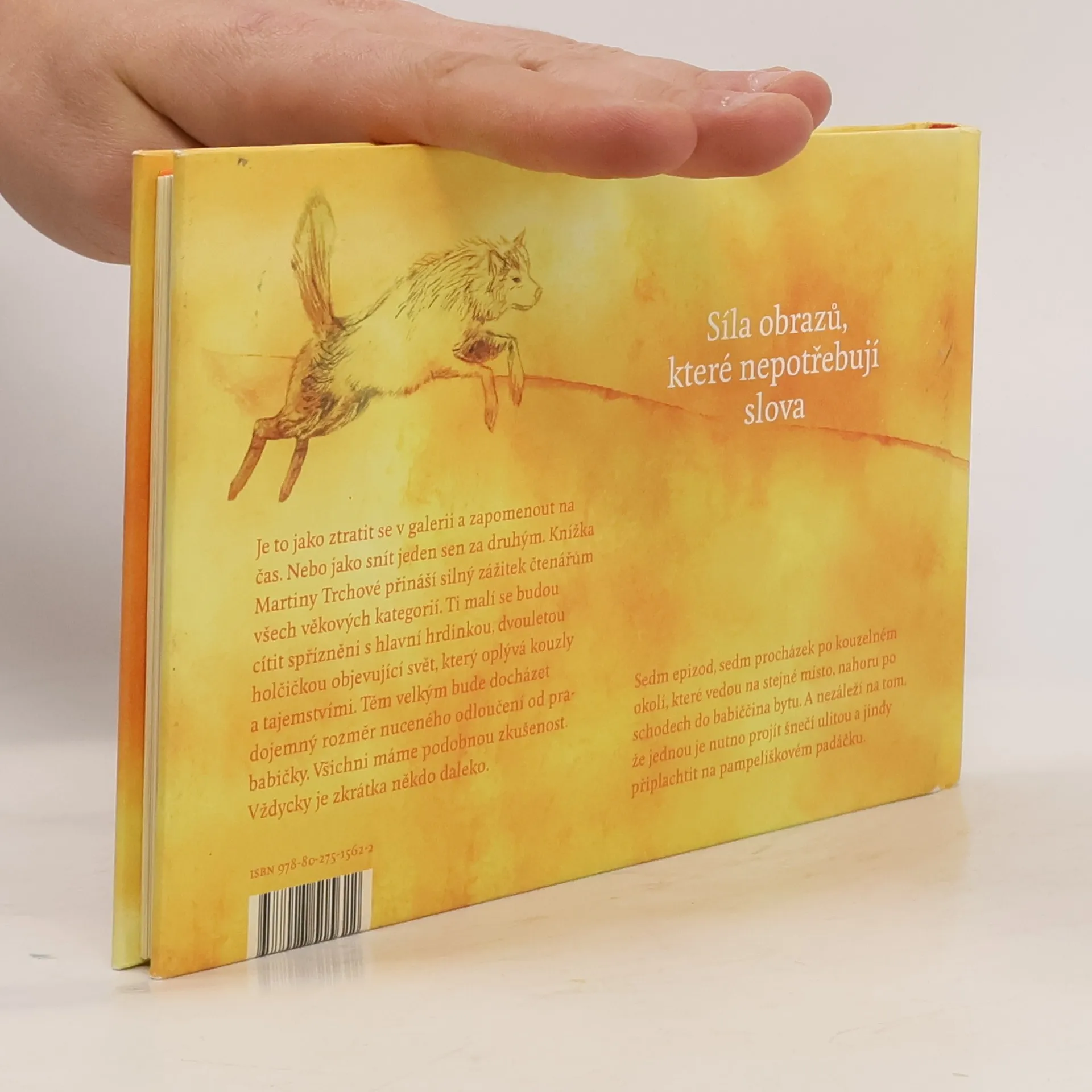 Síla obrazů, které nepotřebují slova.Je to jako ztratit se v galerii a zapomenout na čas. Nebo jako snít jeden sen za druhým. Knížka Martiny Trchové přináší silný zážitek čtenářům všech věkových kategorií. Ti malí se budou cítit spříznění s hlavní hrdinkou, dvouletou holčičkou objevující svět, který oplývá kouzly a tajemstvími. Těm velkým bude docházet dojemný rozměr nuceného odloučení od prababičky. Všichni máme podobnou zkušenost. Vždycky je zkrátka někdo daleko.Sedm epizod, sedm procházek po kouzelném okolí, které vedou na stejné místo, nahoru po schodech do babiččina bytu. A nezáleží na tom, že jednou je nutno projít šnečí ulitou a jindy připlachtit na pampeliškovém padáčku.