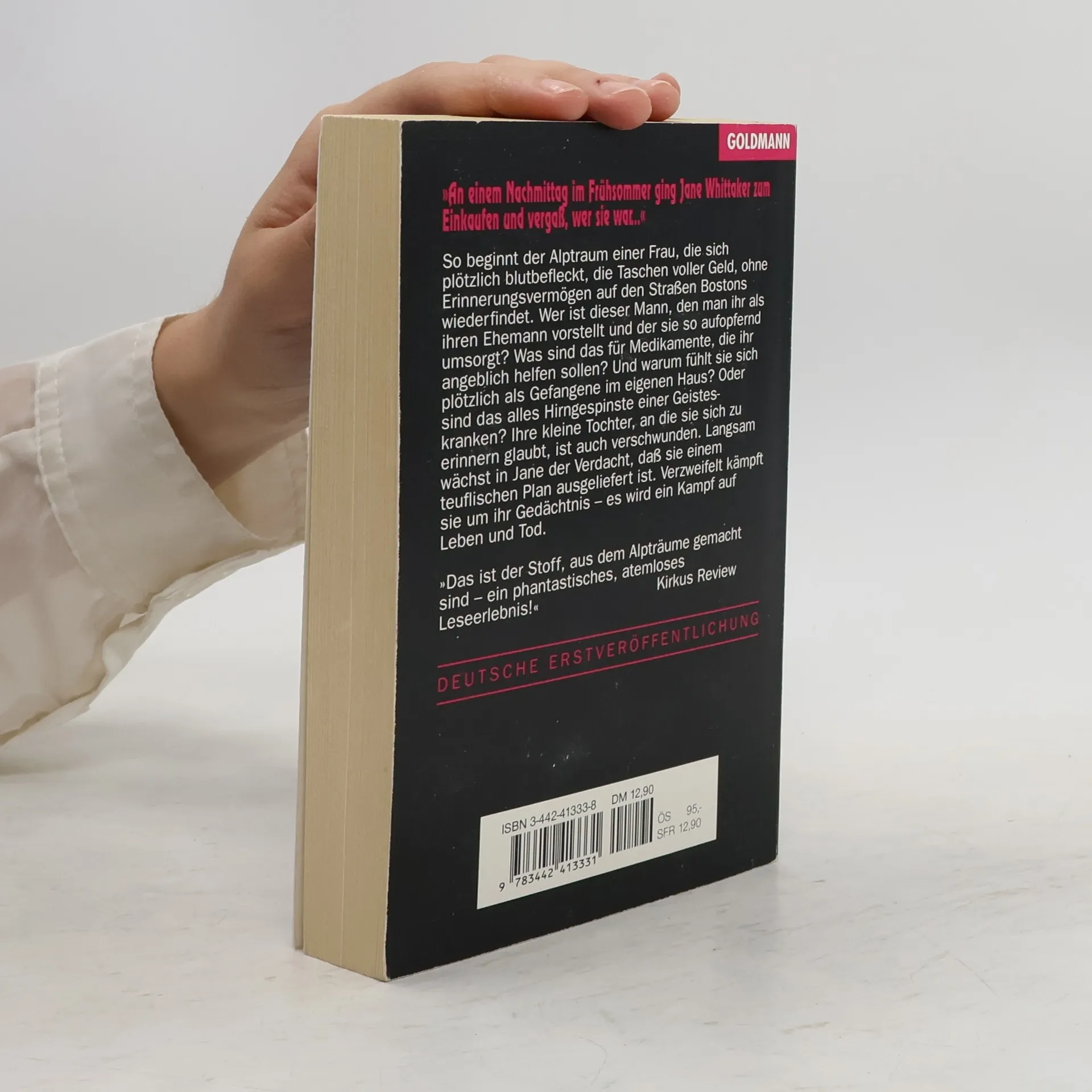 „An einem Nachmittag im Frühsommer ging Jane Whittaker zum Einkaufen und vergaß, wer sie war…“ So beginnt der Alptraum einer Frau, die sich plötzlich blutbefleckt, die Taschen voller Geld und ohne Erinnerungsvermögen auf den Straßen Bostons wiederfindet. Wer ist dieser Mann, den man ihr als ihren Ehemann vorstellt? Was sind das für Medikamente, die ihr angeblich helfen sollen? Und warum fühlt sie sich als Gefangene im eigenen Haus? Verzweifelt kämpft Jane von nun an um ihr Gedächtnis – es wird ein Kampf auf Leben und Tod …