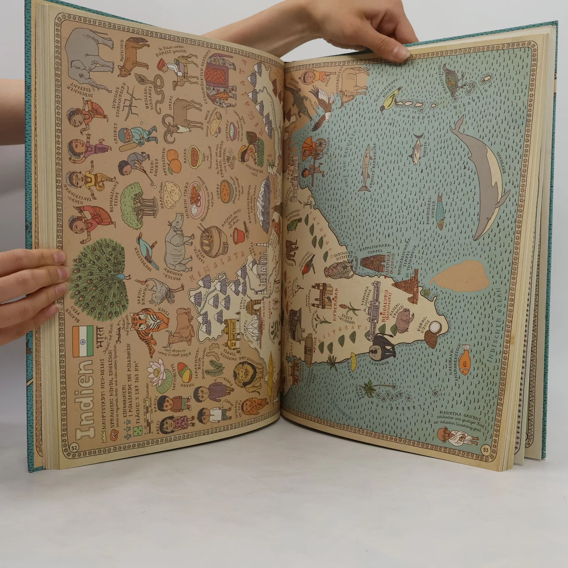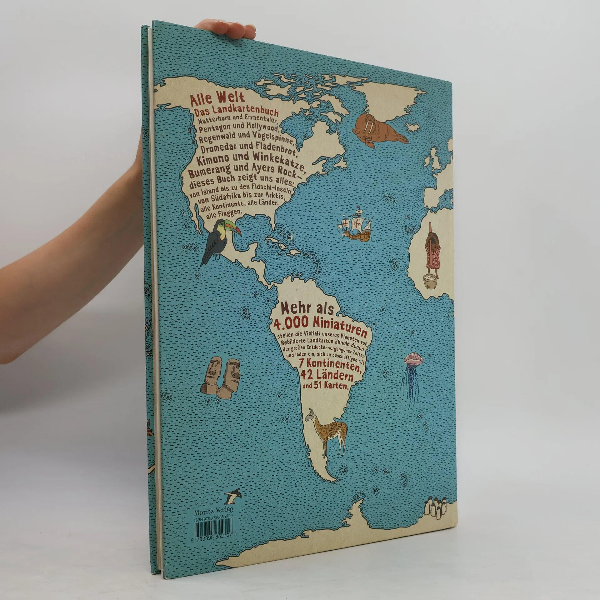 Ein Landkartenbuch, wie es bisher noch keines gab: 51 Länder und Kontinente in Karten, Bildern und Vignetten – ein Augenschmaus! Mehr als drei Jahre haben die beiden polnischen Buchgestalter Aleksandra Mizielinska & Daniel Mizielinski an diesem Werk gearbeitet! Mehr als 4.000 Vignetten haben sie gezeichnet, zwei eigene Schriften entwickelt und sich intensiv mit 51 Ländern und Kontinenten beschäftigt: Was ist das Nationalgericht von Chile? Welche Pflanzen wachsen in Marokko? Was sind die Sehenswürdigkeiten von Finnland? Welchen Sport treiben Japaner? Welcher Tanz stammt aus Österreich, welches Produkt aus der Schweiz? Auf der Deutschlandkarte finden sich das Bauhaus, der VW Käfer, Johannes Gutenberg, die Bremer Stadtmusikanten, ein Spreewaldkahn, Pumpernickel, die Porta Nigra und noch vieles mehr. Und so geht es weiter - mit Frankreich, Mexiko, den Fidschi-Inseln ... Ein Buch, das durch grafische Gestaltung und Lust am Detail von Anfang bis Ende überzeugt - ein echter Klassiker!