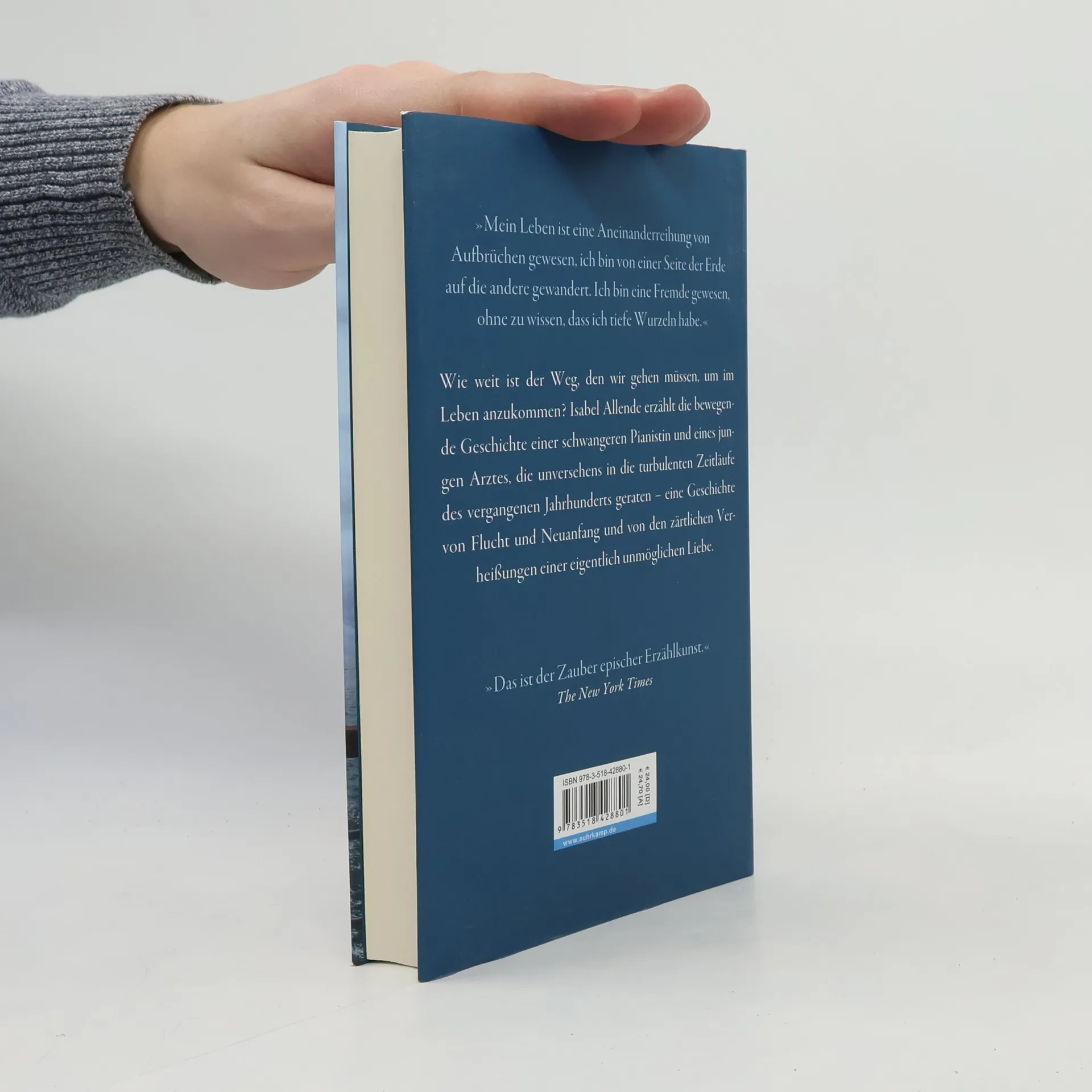 Der junge, idealistische Katalane Víctor Dalmau beginnt gerade als Arzt zu praktizieren, da bricht der Bürgerkrieg aus. Seine Familie beschließt, das belagerte Barcelona zu verlassen, aber der Marsch über die Pyrenäen endet desaströs. Unterdessen stirbt Víctors geliebter Bruder an der Front, und Víctor bringt es nicht über sich, seiner hochschwangeren Schwägerin Roser, einer angehenden Pianistin aus armen Verhältnissen, die ganze Wahrheit zu sagen. Und auch in Frankreich ist kein Bleiben, deshalb organisiert Víctor für Roser und sich in letzter Minute eine Überfahrt nach Südamerika. Im chilenischen Exil wächst sich ihre Verbundenheit nach und nach zu etwas Größerem aus, ist es Liebe? Rosas harte Arbeit zahlt sich jedenfalls aus, sie wird weithin gefeiert für ihr Klavierspiel. Für sie und Víctor scheint ein spätes gemeinsames Glück greifbar nahe – bis plötzlich eine weitere politische Katastrophe ihre Pläne zu vereiteln droht … Wie weit ist der Weg, den wir gehen müssen, um im Leben anzukommen? Isabel Allende erzählt die bewegende Geschichte einer schwangeren Pianistin und eines jungen Arztes, die unversehens in die turbulenten Zeitläufe des vergangenen Jahrhunderts geraten – eine Geschichte von Flucht und Neuanfang und den zärtlichen Verheißungen einer eigentlich unmöglichen Liebe.