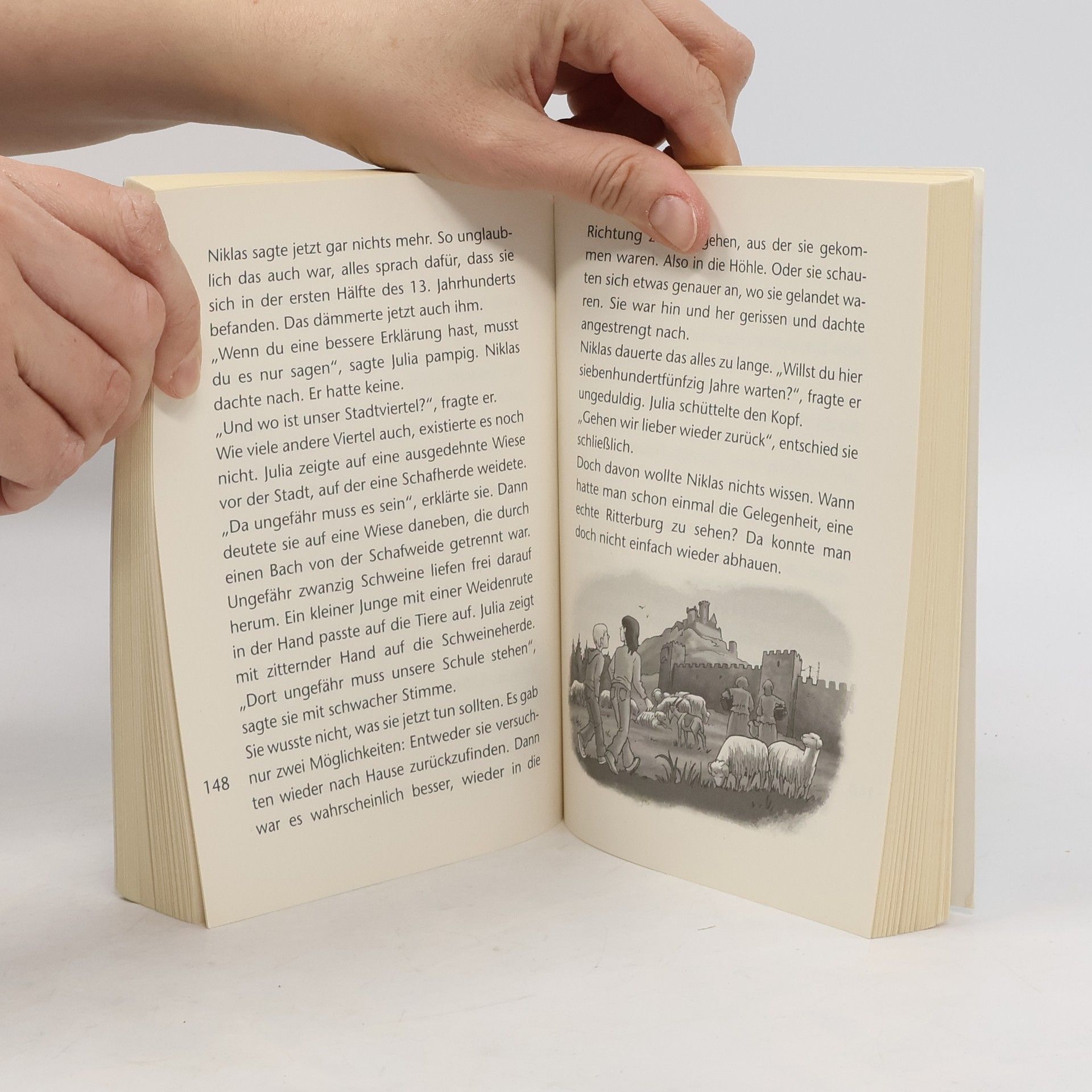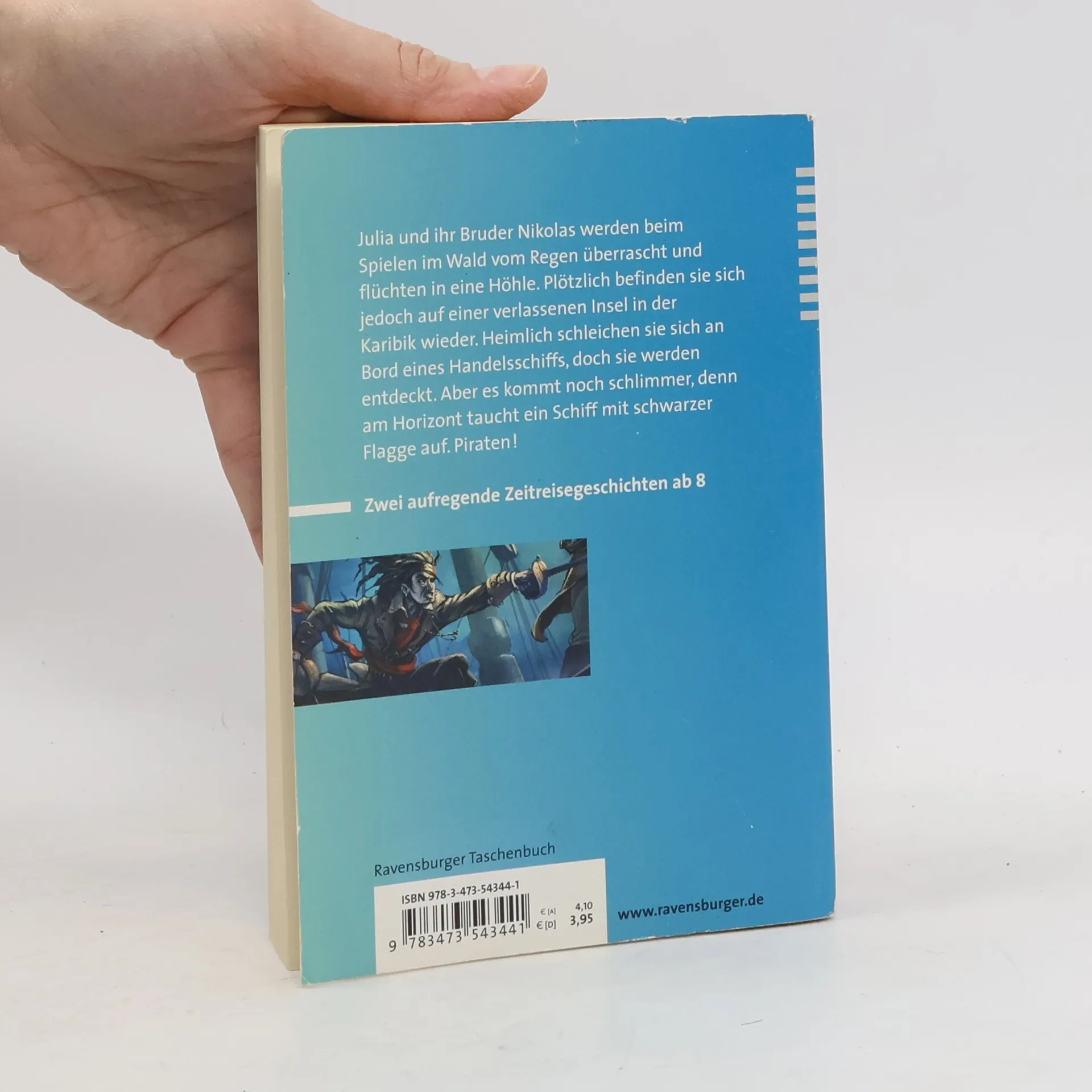 Julia und Nikolas reisen durch die Zeit. Der Hafen scheint friedlich doch am Horizont taucht ein Schiff mit schwarzer Flagge auf - Piraten!