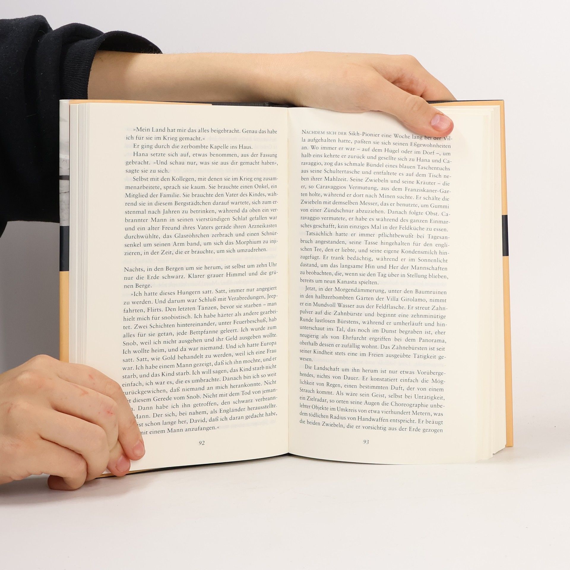 Die Lektüre des Buches von Michael Ondaatje ist ebenso lohnenswert wie der Kinofilm. Der Roman erzählt von vier Personen, die 1945 in einer zerbombten toskanischen Villa gestrandet sind und versuchen, ein normales Leben zu führen. Hana, eine kanadische Krankenschwester, kümmert sich um einen schwer verbrannten Mann, der in der Wüste abgestürzt ist. Täglich wäscht sie ihn und liest ihm vor. Kurz nach ihrem Einzug erscheint Caravaggio, ein ehemaliger Dieb, der im Krieg schwer verletzt wurde und Hana beschützt. Kip, ein junger Inder und Meister im Bombenentschärfen, gesellt sich zu ihnen. Jeder der Protagonisten ist durch den Krieg geprägt und sucht an diesem Ort der Welt eine Atempause. Ondaatje nutzt Rückblenden und Traumsequenzen, um die Wunden und Demütigungen der Charaktere darzustellen. Die Erzählweise ist fragmentarisch, und der „englische Patient“ berichtet von seinem Absturz in der libyschen Wüste und dem Verlust seiner großen Liebe. Ondaatjes Beschreibungen der Wüste und der Nomadentraditionen sind eindrucksvoll und bleiben im Gedächtnis. Der Roman fordert vom Leser Konzentration und Aufmerksamkeit, um seine Poesie zu entfalten. In der Malerei wäre dieses Werk ein Bild aus sanften Pastelltönen, verborgen unter einer Staubschicht. Für Fans von Ondaatjes Romanen ist es erwähnenswert, dass die Geschichte von Hana und Caravaggio in einem früheren Werk begann.