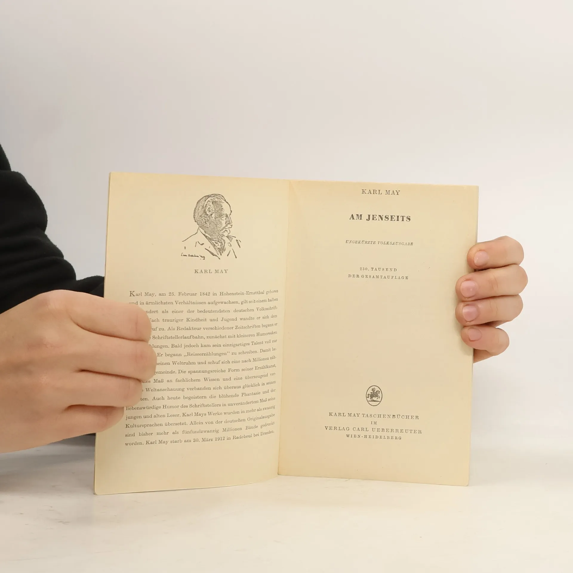 Karl May: Am Jenseits Edition Holzinger. Taschenbuch Berliner Ausgabe, 2013 Vollstandiger, durchgesehener Neusatz mit einer Biographie des Autors bearbeitet und eingerichtet von Michael Holzinger Textgrundlage ist die Ausgabe: Karl May: Am Jenseits. Illustrierte Reiseerzahlungen, 1.-4. Tausend, Freiburg i.Br.: Friedrich Ernst Fehsenfeld, 1912 [= Karl Mays Illustrierte Reiseerzahlungen, Band XXV]. Herausgeber der Reihe: Michael Holzinger Reihengestaltung: Viktor Harvion Umschlaggestaltung unter Verwendung des Bildes: Karl May (Fotografie von Erwin Raupp, 1907) Gesetzt aus Minion Pro, 10 pt