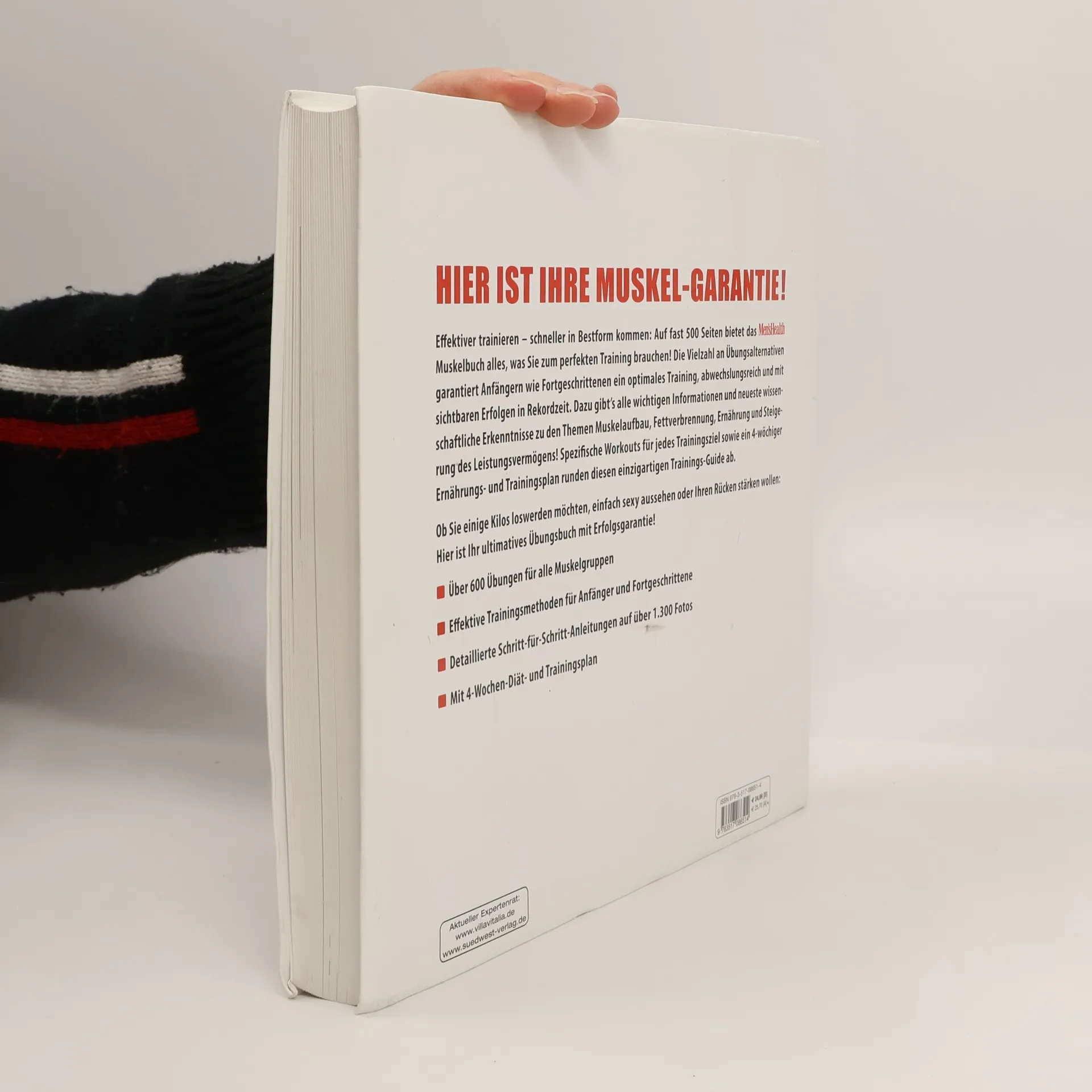 Hier ist Ihre Muskel-Garantie! Effektiver trainieren – schneller in Bestform kommen: Auf fast 500 Seiten bietet „Das Men’s Health Muskelbuch“ alles, was Sie zum perfekten Training brauchen! Mehr als 600 Übungen für alle Muskelgruppen, übersichtlich gegliedert werden auf rund 1200 Fotos anschaulich und nachvollziehbar dargestellt. Die Vielzahl an Übungsalternativen garantiert sowohl Anfängern wie Fortgeschrittenen ein optimales Training, abwechslungsreich und mit sichtbaren Erfolgen in Rekordzeit. Dazu gibt‘s alle wichtigen Informationen und neueste wissenschaftliche Erkenntnisse zu den Themen Muskelaufbau, Fettverbrennung, Ernährung und Steigerung des Leistungsvermögens! Spezifische Workouts für jedes Trainingsziel sowie ein 4-wöchiger Ernährungs-und-Trainingsplan runden diesen einzigartigen Trainings-Guide ab. Ob Sie einige Kilos loswerden möchten, einfach sexy aussehen oder Ihren Rücken stärken wollen: Hier ist Ihr ultimatives Übungsbuch mit Erfolgsgarantie! Ausstattung: durchgehend 4c