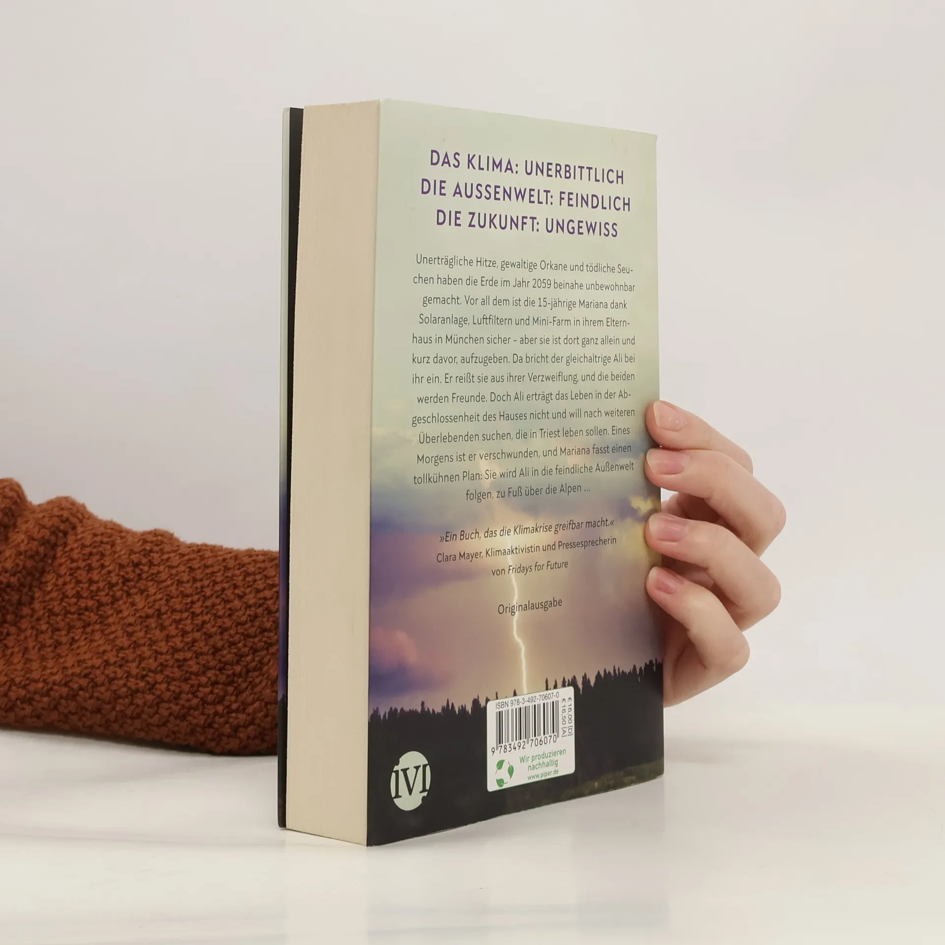 Das Klima: unerbittlich Die Außenwelt: feindlich Die Zukunft: ungewiss … es sei denn, man nimmt sie in die eigene Hand! Unerträgliche Hitze, gewaltige Orkane und tödliche Seuchen haben die Erde im Jahr 2059 beinahe unbewohnbar gemacht. Vor all dem ist die 15-jährige Mariana im Haus ihrer Eltern in München sicher – doch sie ist ganz allein und kurz davor aufzugeben. Das ändert sich, als der gleichaltrige Ali bei ihr einbricht. Er reißt sie aus ihrer Verzweiflung und die beiden werden Freunde. Ali will jedoch nicht bleiben. Er erträgt die abgeschlossene Welt im Haus nicht und will weitere Überlebende suchen. Eines Morgens ist er verschwunden, und Mariana fasst einen tollkühnen Plan: Sie wird Ali in die feindliche Außenwelt folgen, zu Fuß über die Alpen … Mit einem Nachwort von Clara Mayer, Klimaaktivistin und Pressesprecherin von Fridays for Future. »Ein Buch, das die Klimakrise greifbar macht.« Clara Mayer »›Mad Max: Fury Road‹ trifft Marlen Haushofers ›Die Wand‹: Dieser schonungslose und doch hoffnungsvolle Jugendroman verbindet Feminismus, Klimakrise und knallharte Action zu einem unglaublich spannenden dystopischen Plot, der nicht nur räumlich gar nicht so weit von unserer Realität entfernt scheint.« Magda Birkmann, Buchhändlerin bei Ocelot