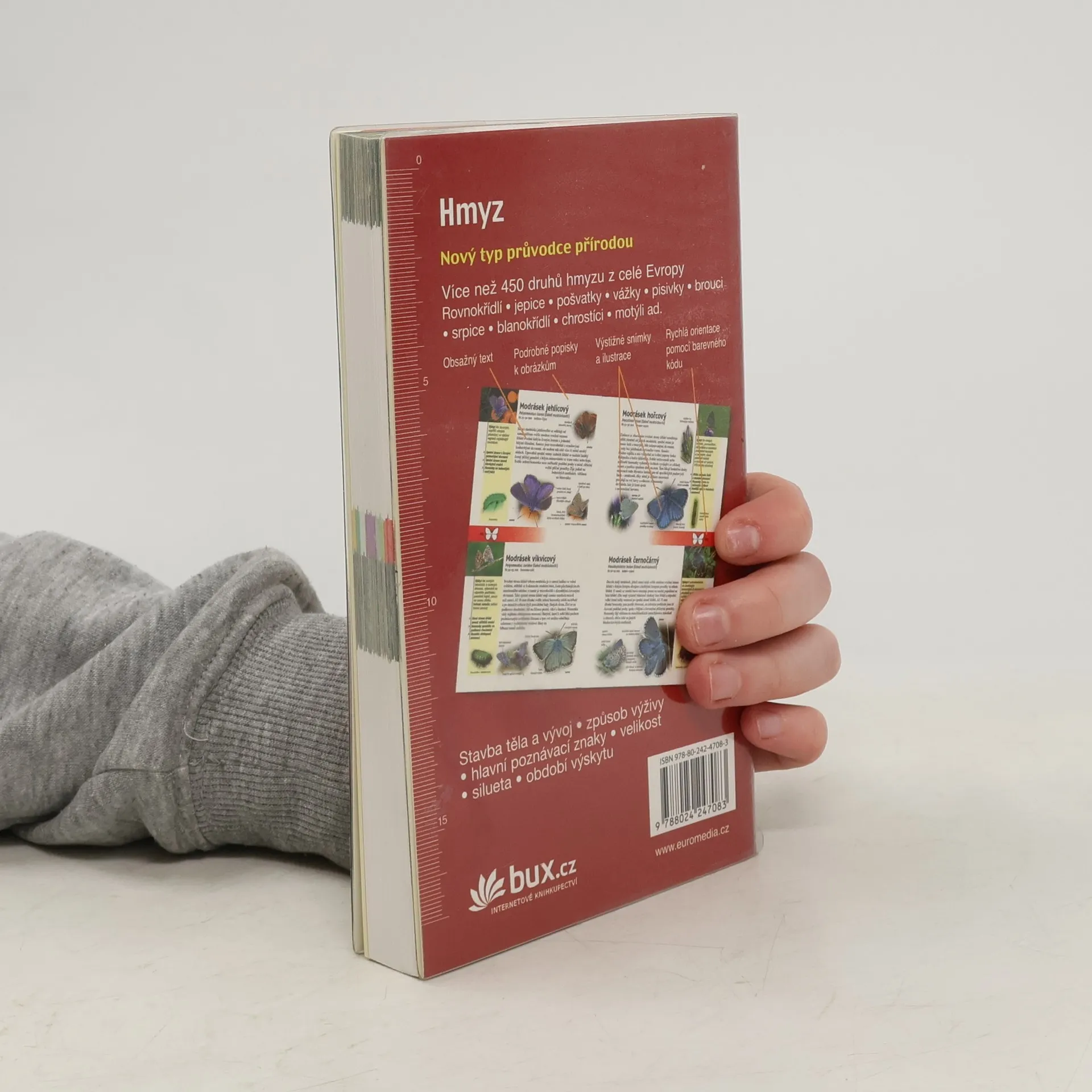 Výpravná publikace obsahuje přes 450 druhů hmyzu z celé Evropy. Výstižné barevné fotografie, přehledné popisky a podrobné texty podávají mnoho zajímavostí a přibližují hlavní poznávací znaky jednotlivých druhů, stavbu těla a vývoj, způsob výživy, velikost a období výskytu a mnoho dalšího.
