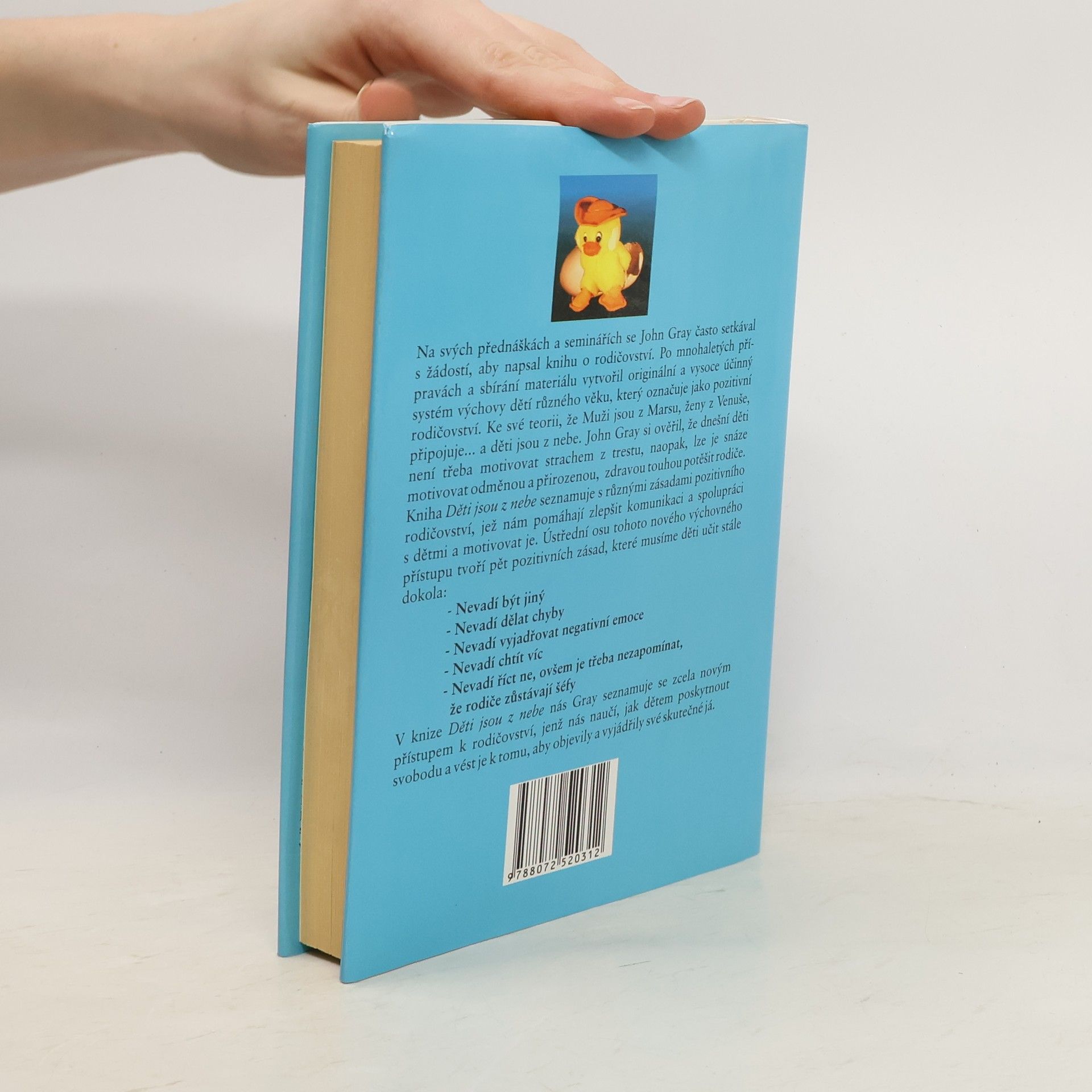 S radostí, láskou a porozuměním vychovejte sebevědomé, vstřícné a citlivé děti. Po mnohaletých přípravách vytvořil John Gray vysoce účinný systém výchovy dětí různého věku, který označuje jako pozitivní rodičovství. Ke své teorii, že muži jsou z Marsu, ženy z Venuše, připojuje: a děti jsou z nebe. John Gray dokázal, že dnešní děti není třeba motivovat strachem z trestu, naopak, snáze je lze motivovat odměnou a přirozenou, zdravou touhou potěšit rodiče. Ústřední osu tohoto nového přístupu tvoří pět pozitivních zásad, které musíme děti učit stále dokola: Nevadí být jiný. Nevadí dělat chyby. Nevadí vyjadřovat negativní emoce. Nevadí chtít víc. Nevadí říct ne, ovšem je třeba nezapomínat, že rodiče zůstávají šéfy. Poskytněte dětem svobodu a veďte je k tomu, aby objevily a vyjádřily své skutečné já! (zásady pozitivního rodičovství, vedoucí k výchově spolupracujících, sebevědomých a citlivých dětí)